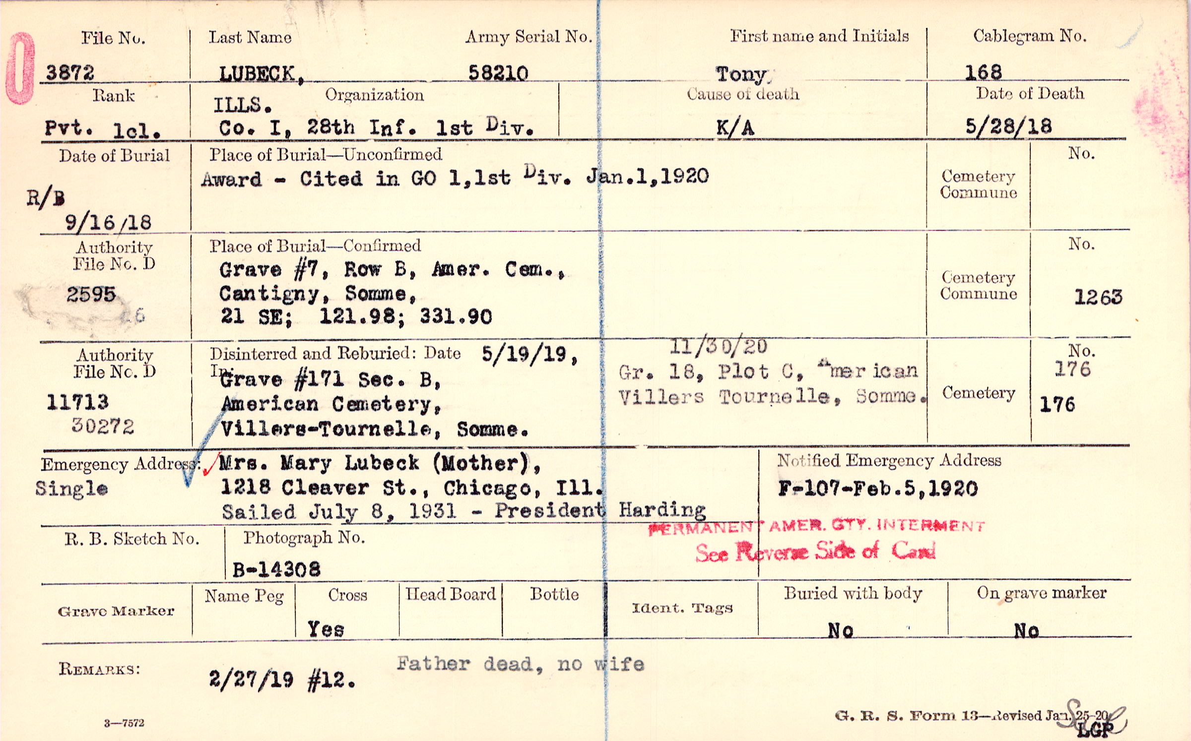 Mrs. Mary Lubeck (Mother), 1218 Cleaver St., Chicago, Ill., Single Sailed July 8, 1931 - President Harding