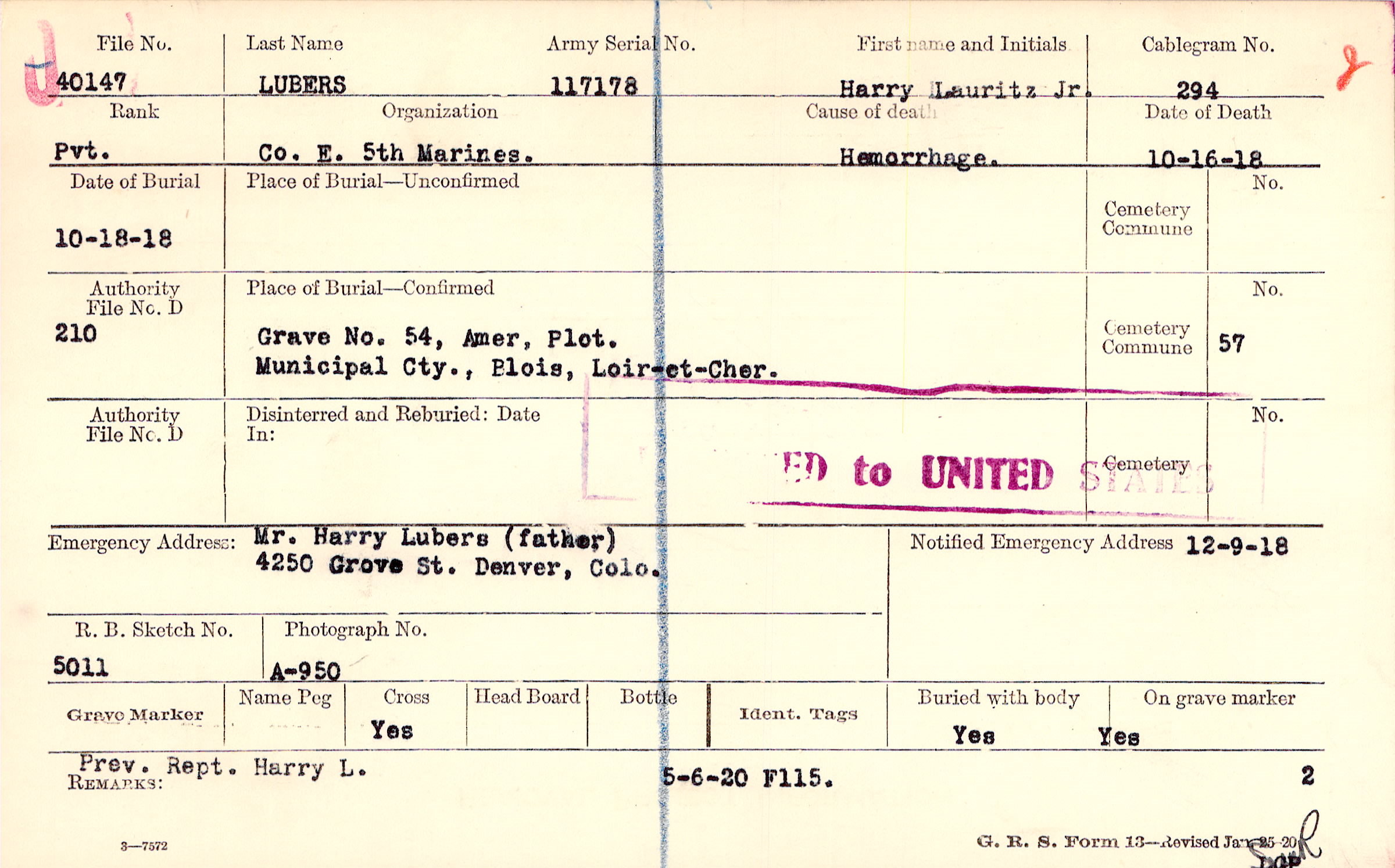 Mr. Harry Lubers (father), 4250 Grove St. Denver, Colo.