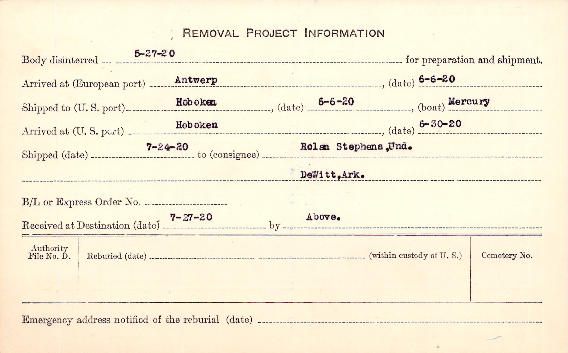 Body disinterred 5/27/1920 for preparation and shipment.
