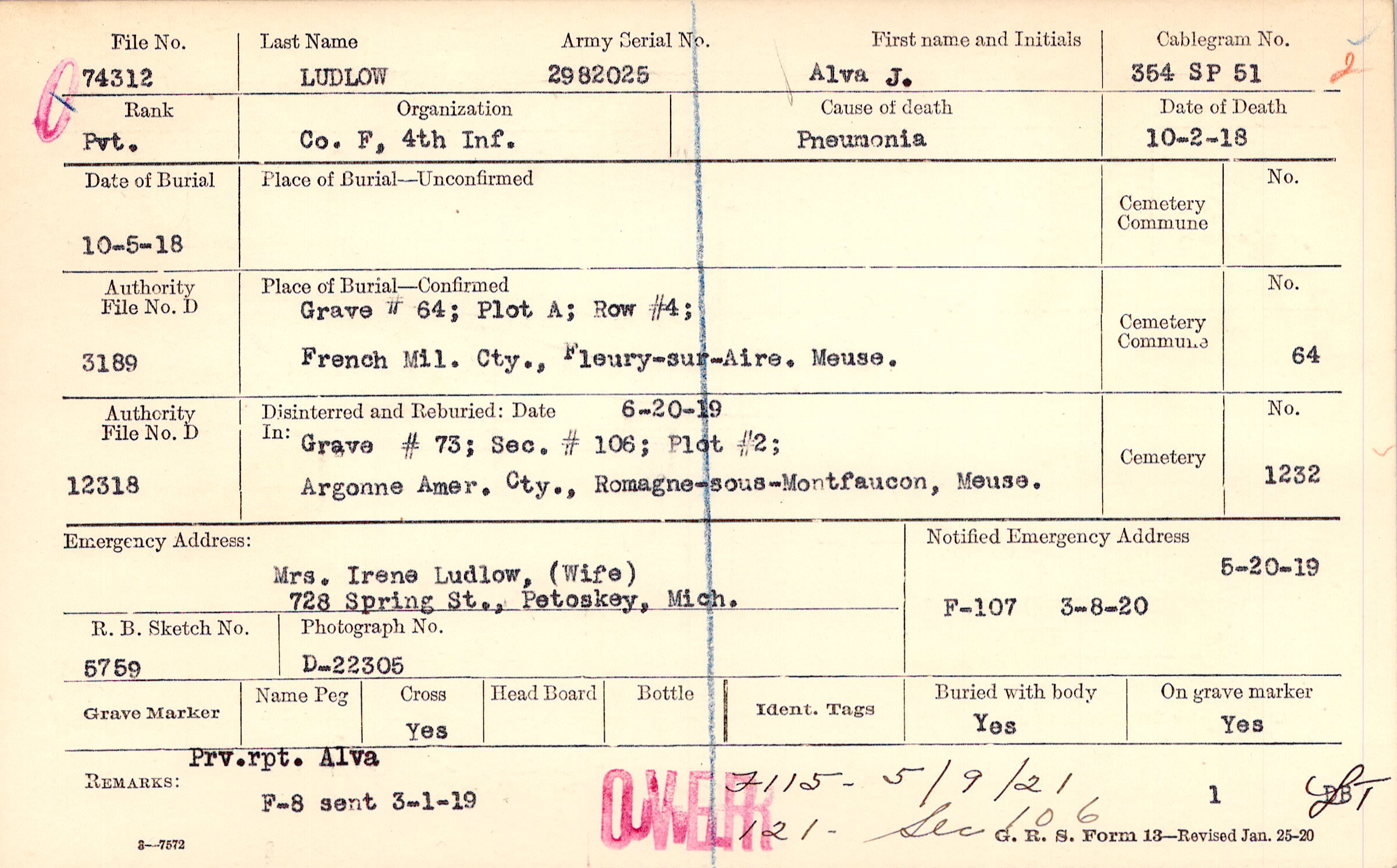 Mrs. Irene Ludlow, (Wife), 728 Spring St., Petoskey, Mich.