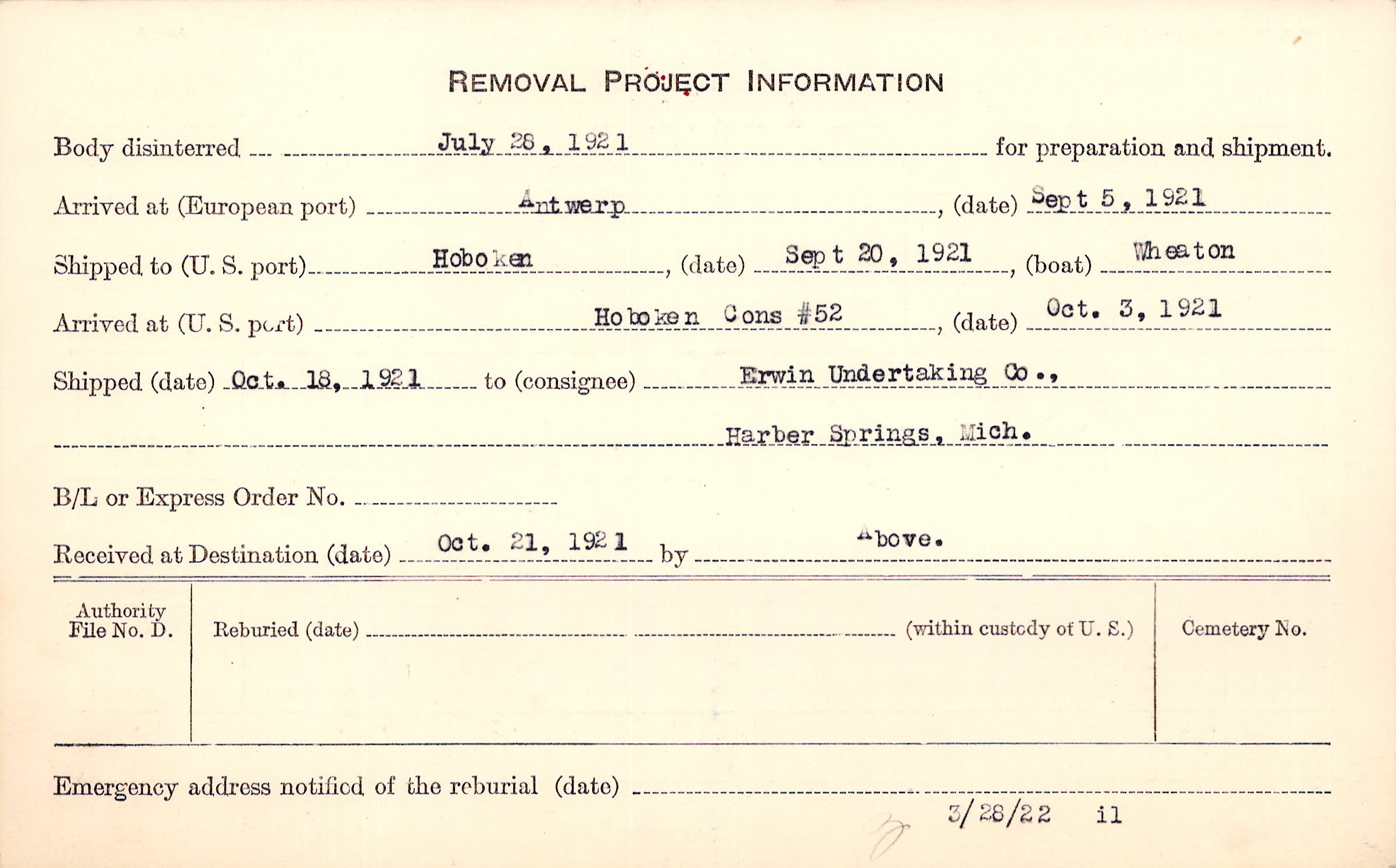 Body disinterred 7/28/1921 for preparation and shipment.