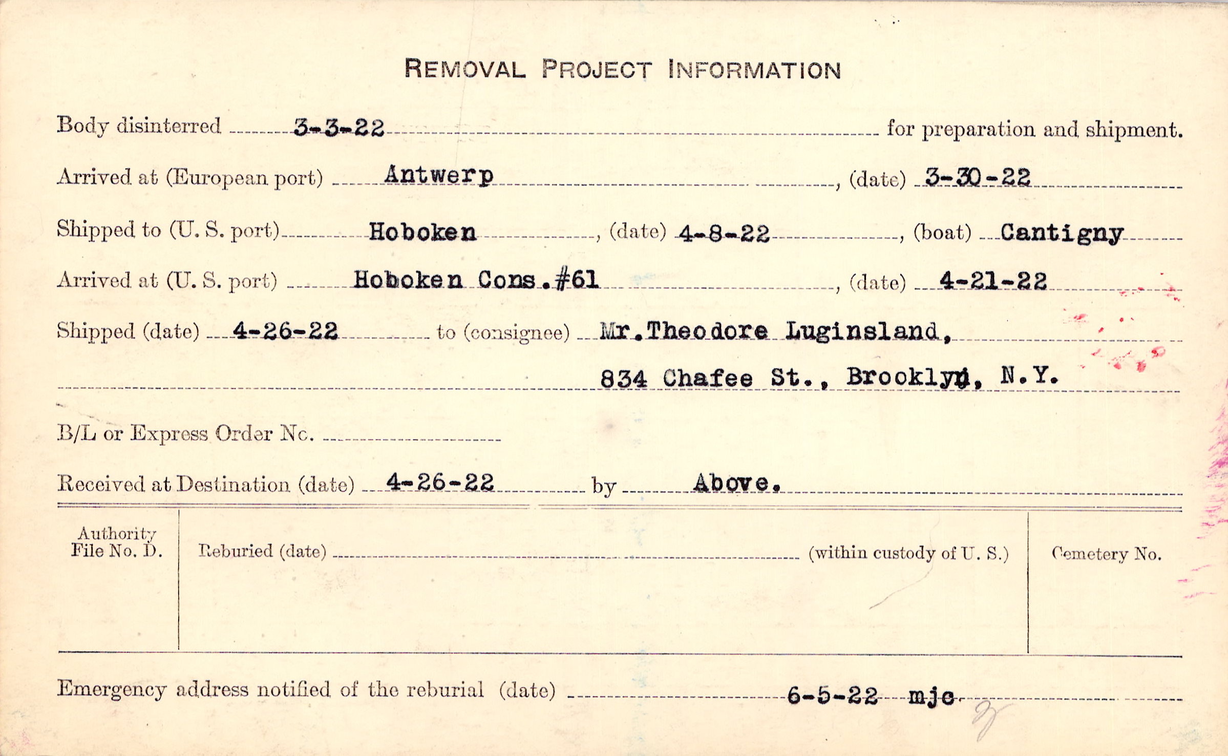 Body disinterred 3/3/1922 for preparation and shipment.