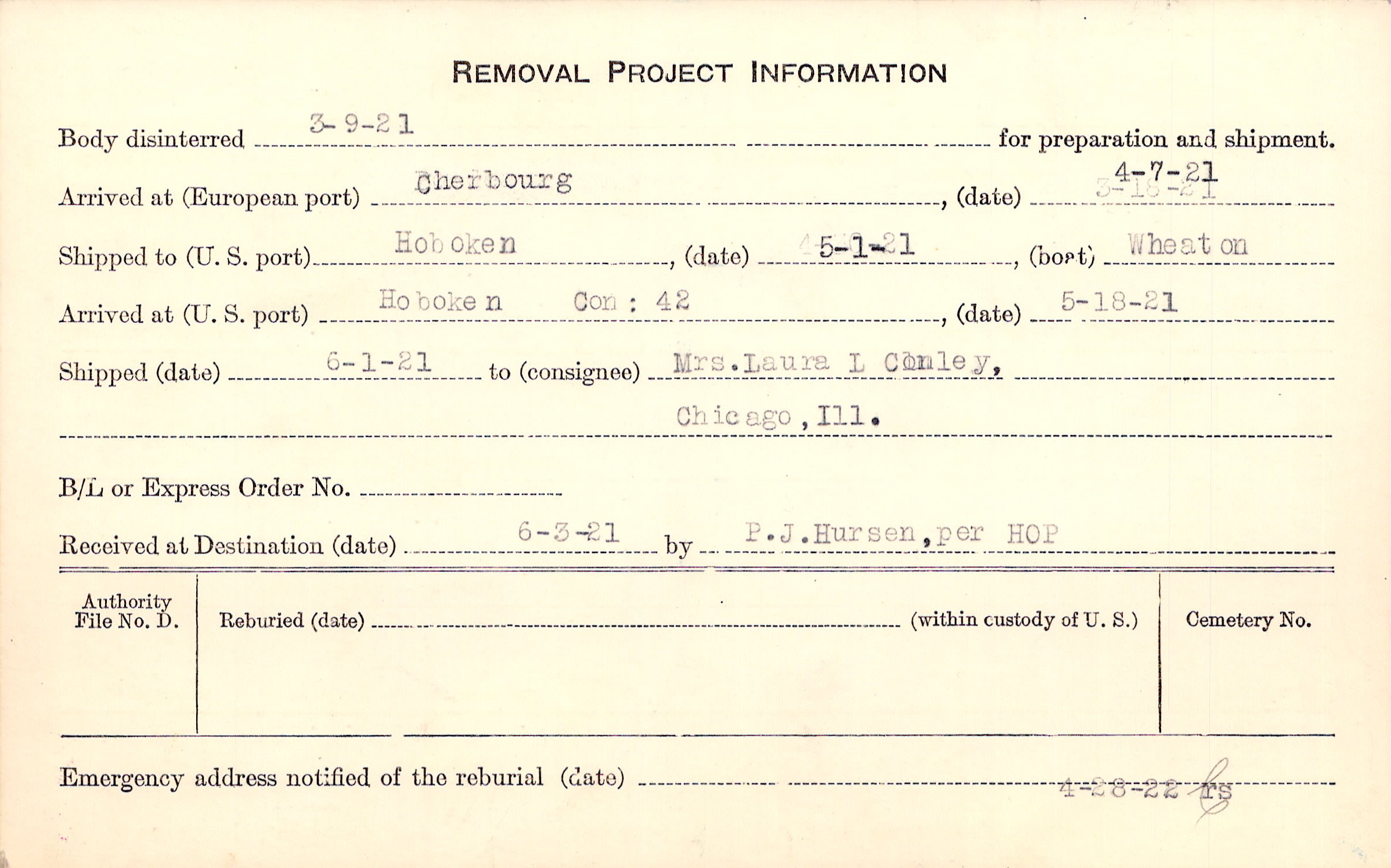 Body disinterred 3/9/1921 for preparation and shipment.