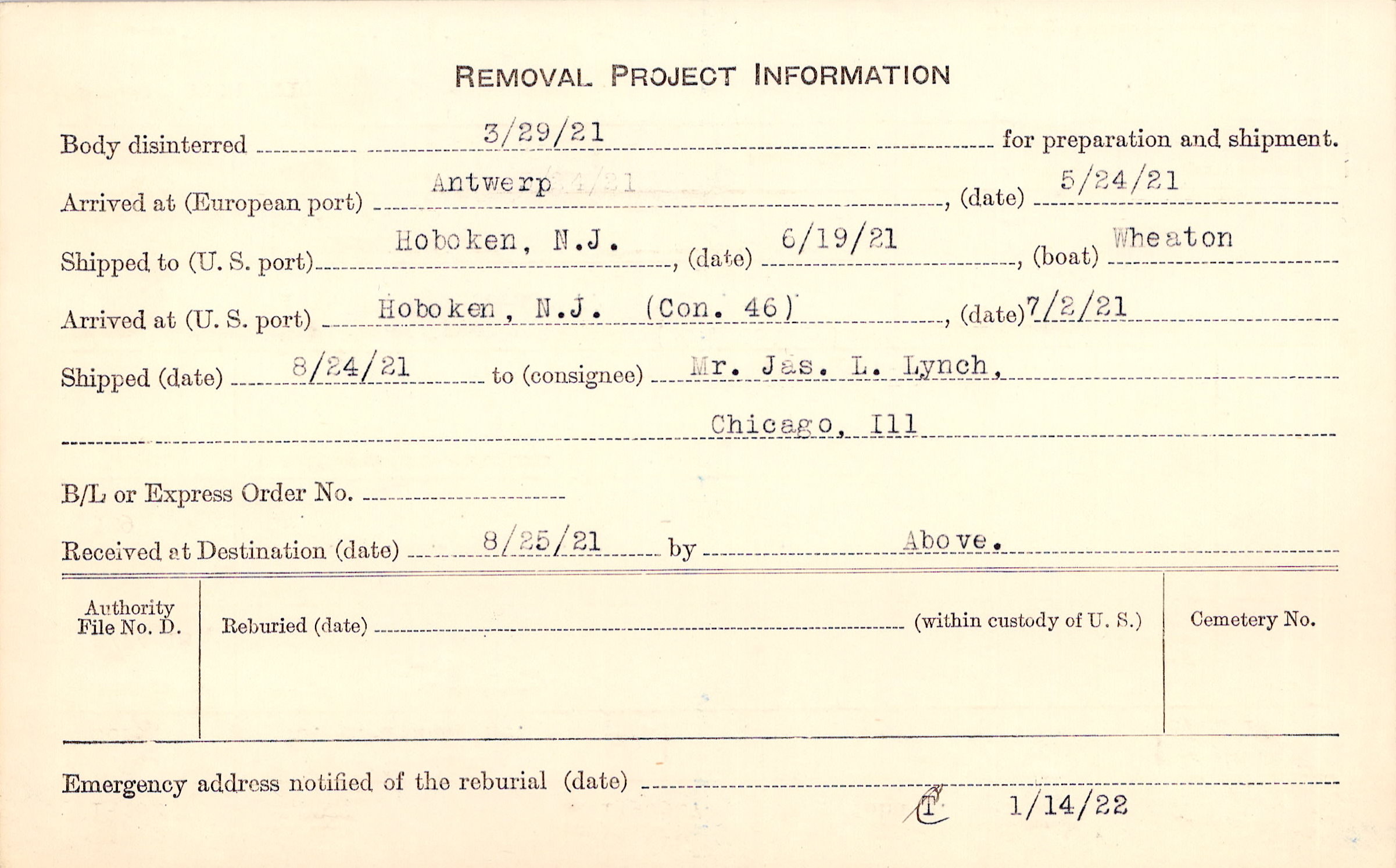 Body disinterred 3/29/1921 for preparation and shipment.