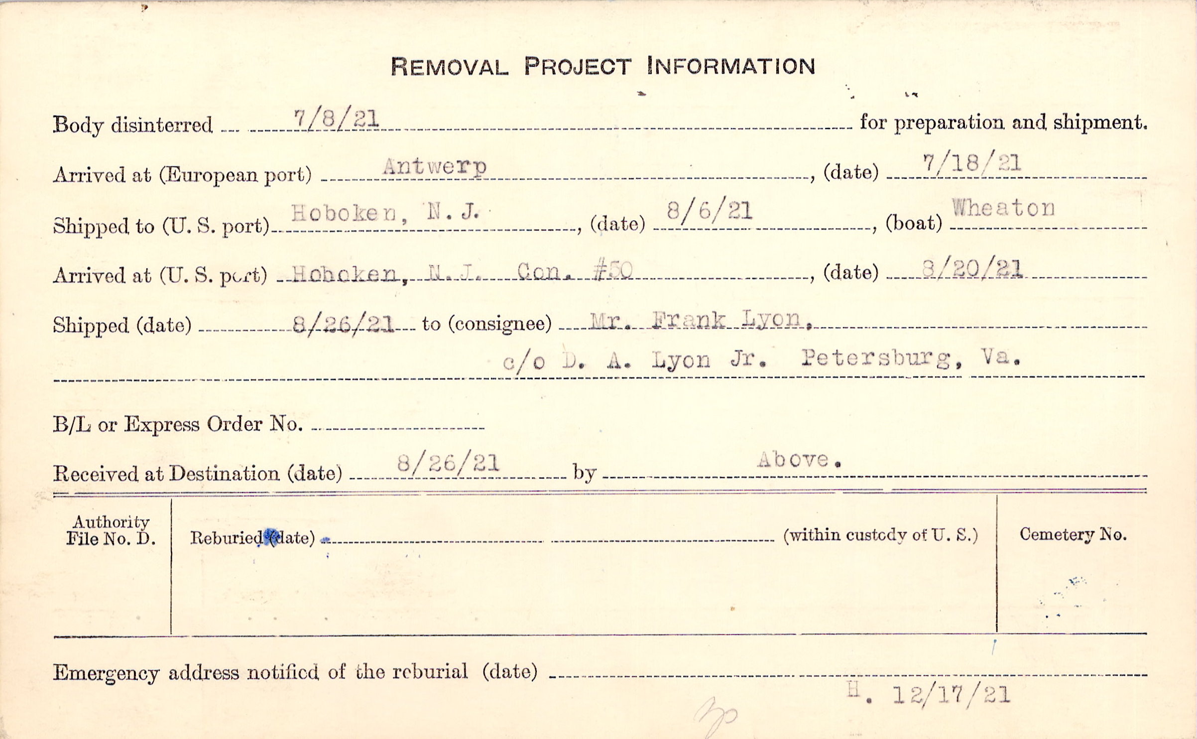 to Mr. Frank Lyon, c/o D. A. Lyon Jr., Petersburg, Va.