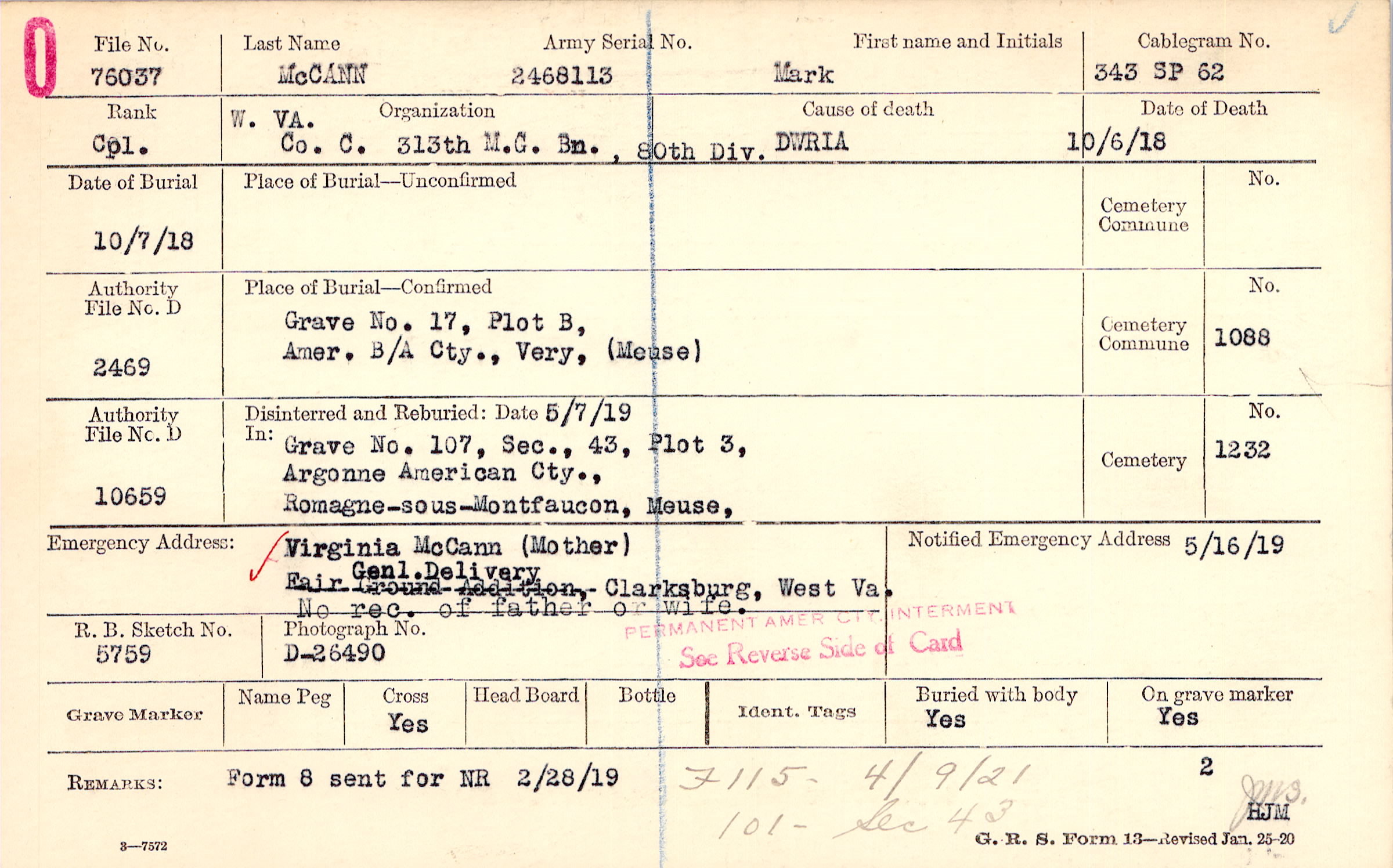 Grave 107, Section 43, Plot 3, Argonne American Cemetery, Romagne-sous-Montfaucon, Meuse