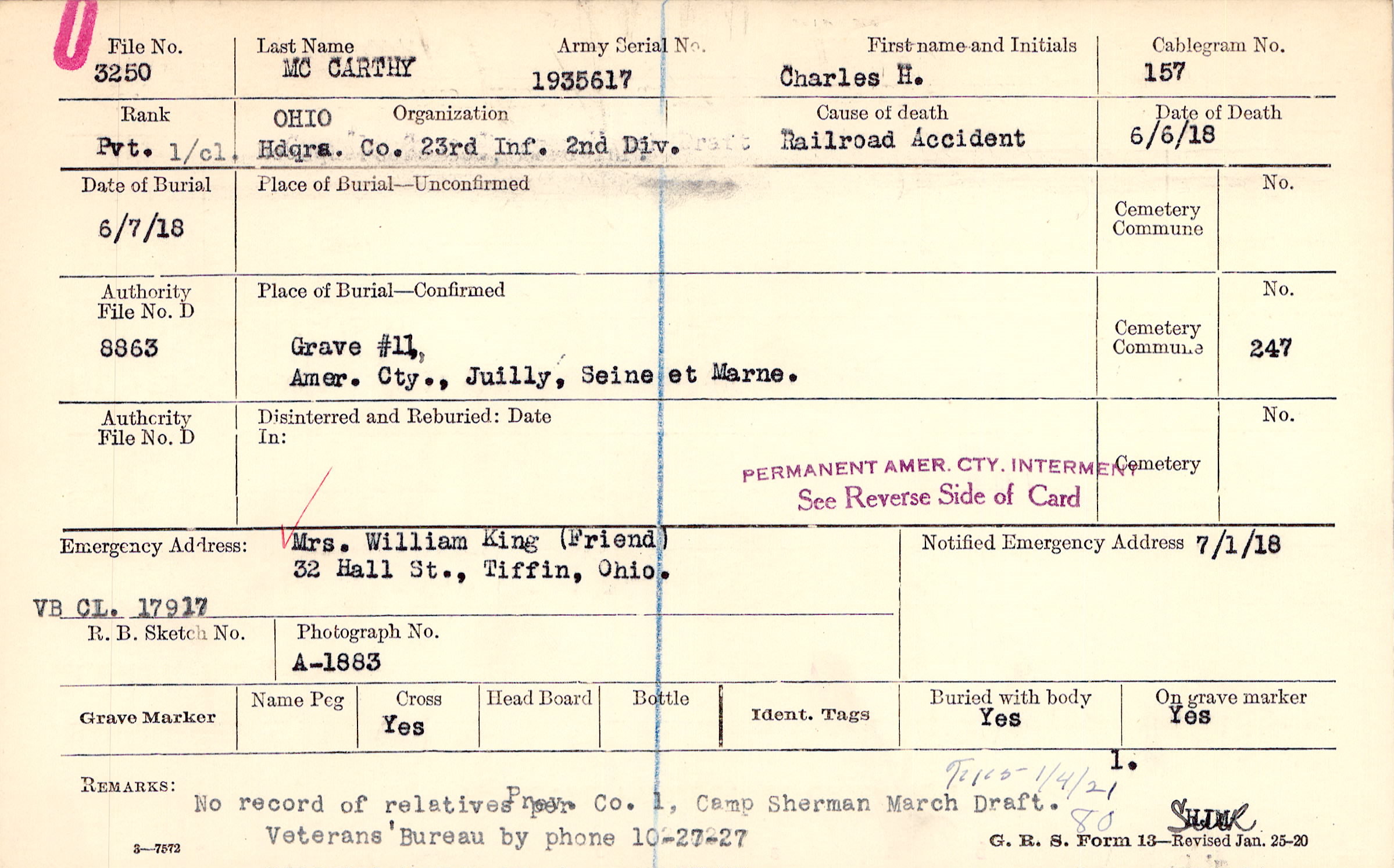 No record of relatives per Co. 1, Camp Sherman March Draft Veterans' Bureau by phone 10-27-27
