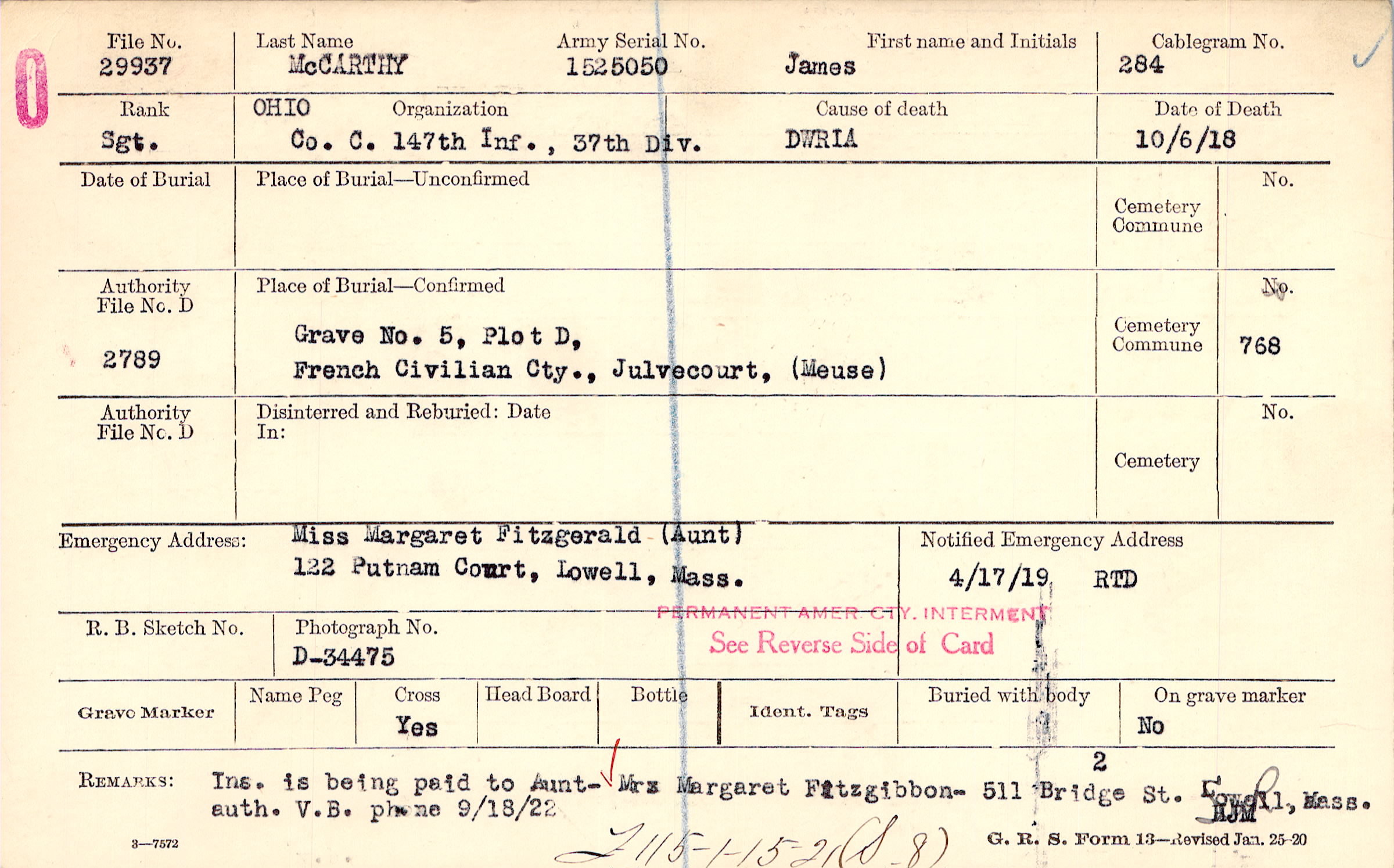 Ins. is being paid to Aunt - Mrs Margaret Fitzgibbon - 511 Bridge St. Lowell, Mass. auth. V. B. phone 9/18/22, F115-1-15-21 (S-8)
