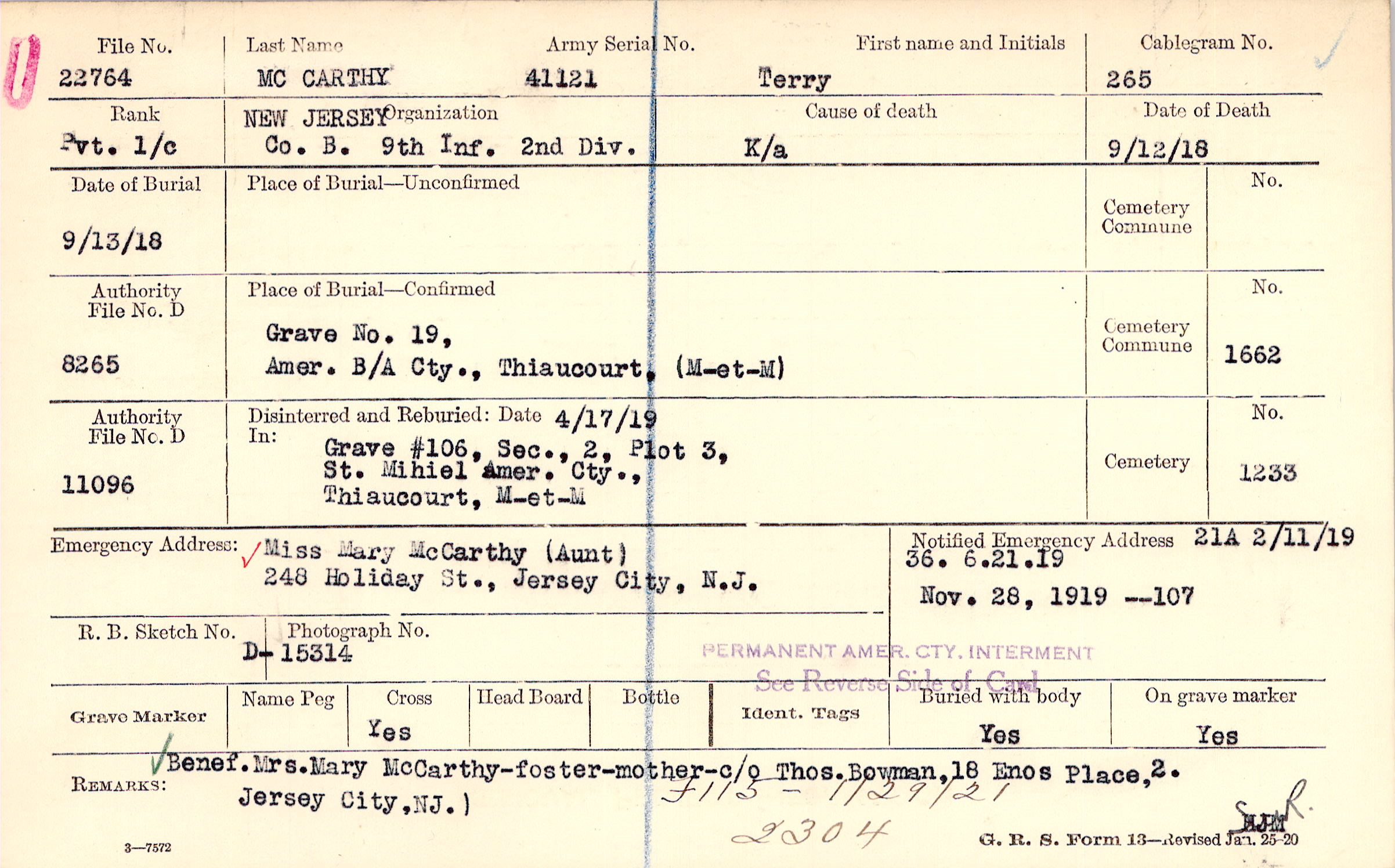 Miss Mary McCarthy (Aunt), 248 Holiday St., Jersey City, N.J.