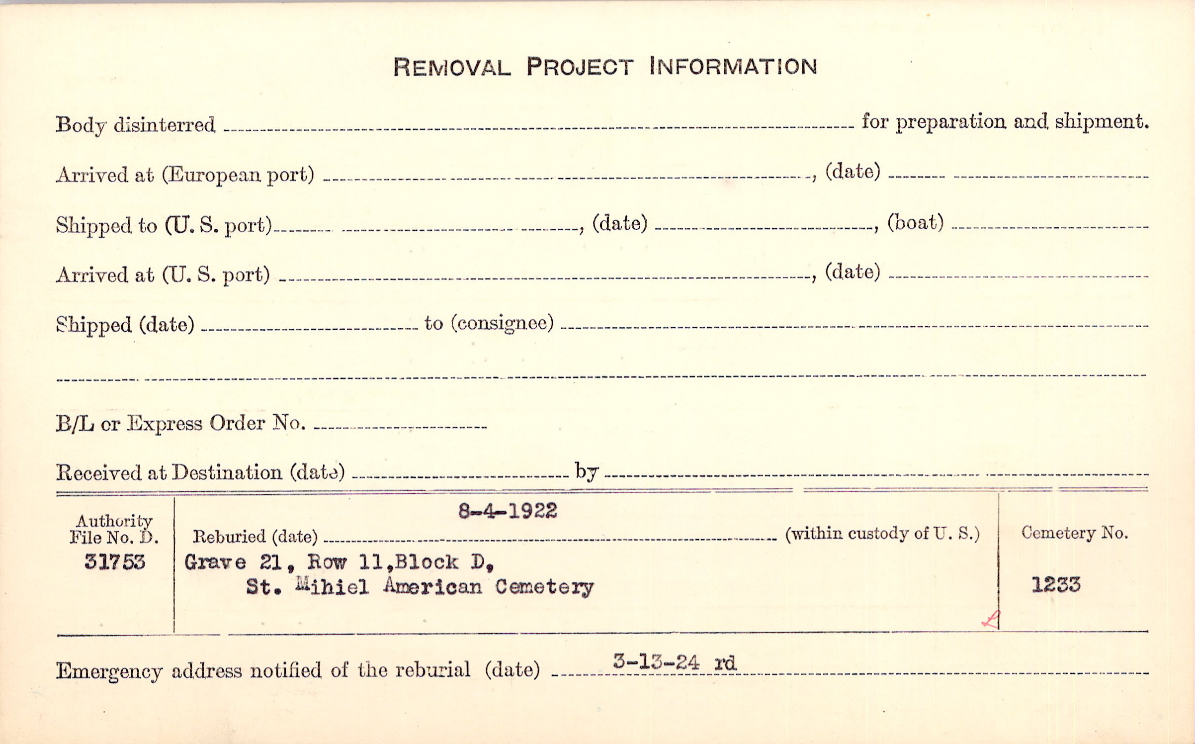 | Permanent Burial in Foreign Cemetery |