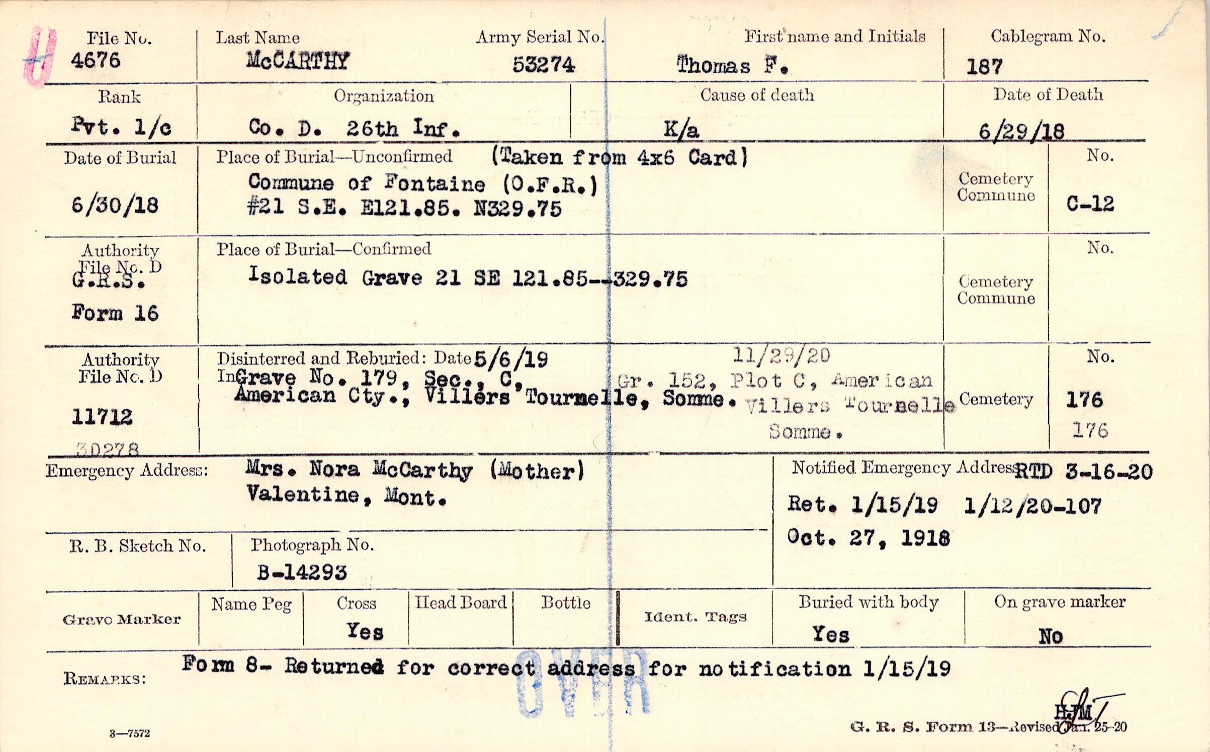 RTD 3/16/1920, Ret 1/15/1919, Form 107: 1/12/1920, Oct 27, 1918