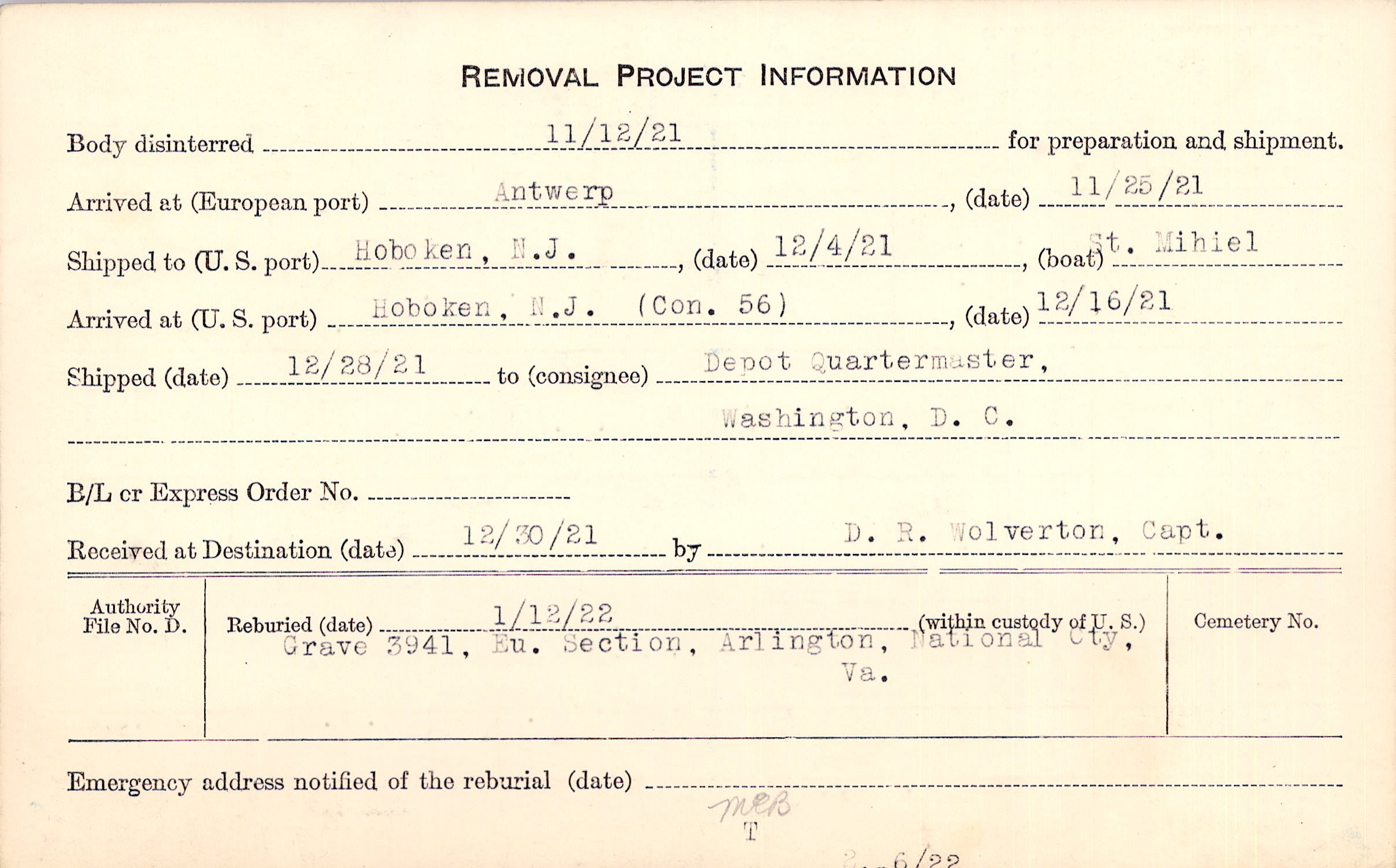 Body disinterred 11/12/1921 for preparation and shipment.