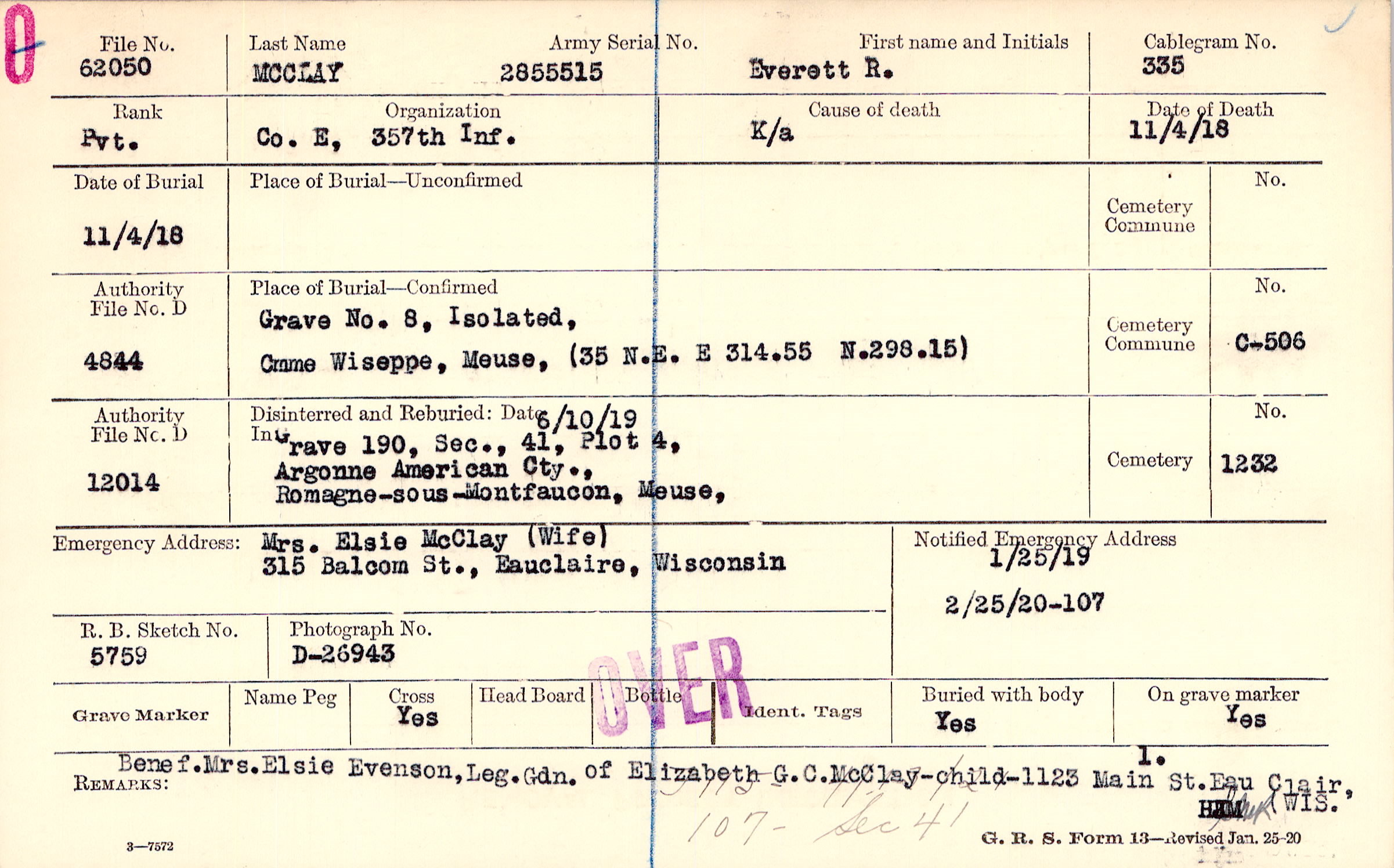 Mrs. Elsie McClay (Wife), 315 Balcom St., Eauclaire, Wisconsin