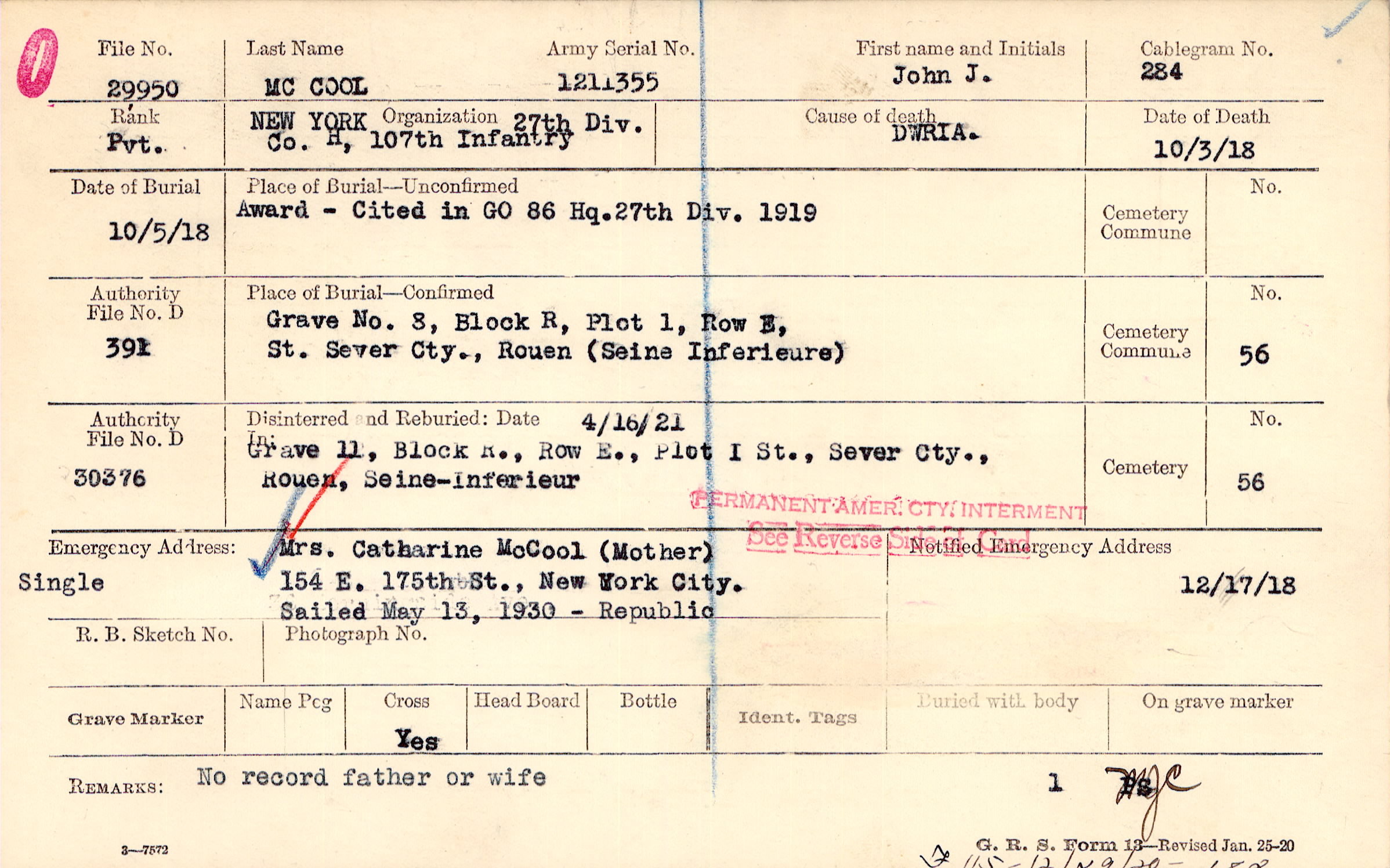 Grave 8, Block R, Plot 1, Row E, St. Sever Cty., Rouen, Seine Inferieure
