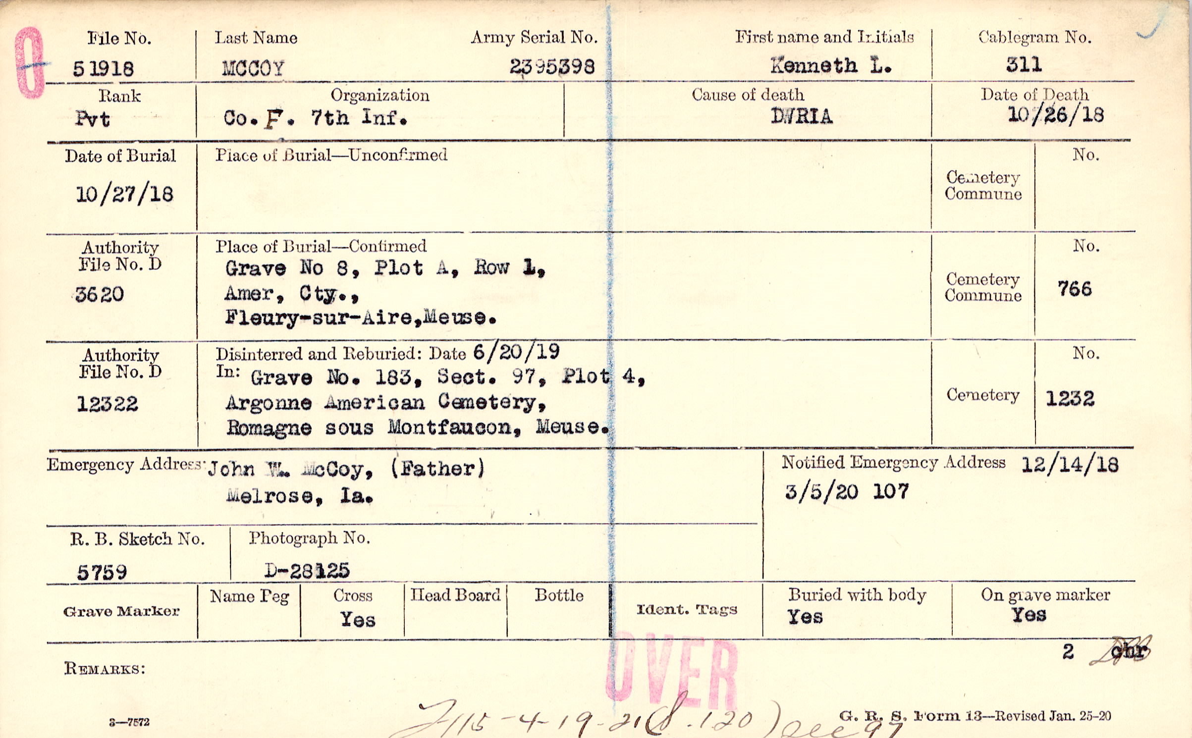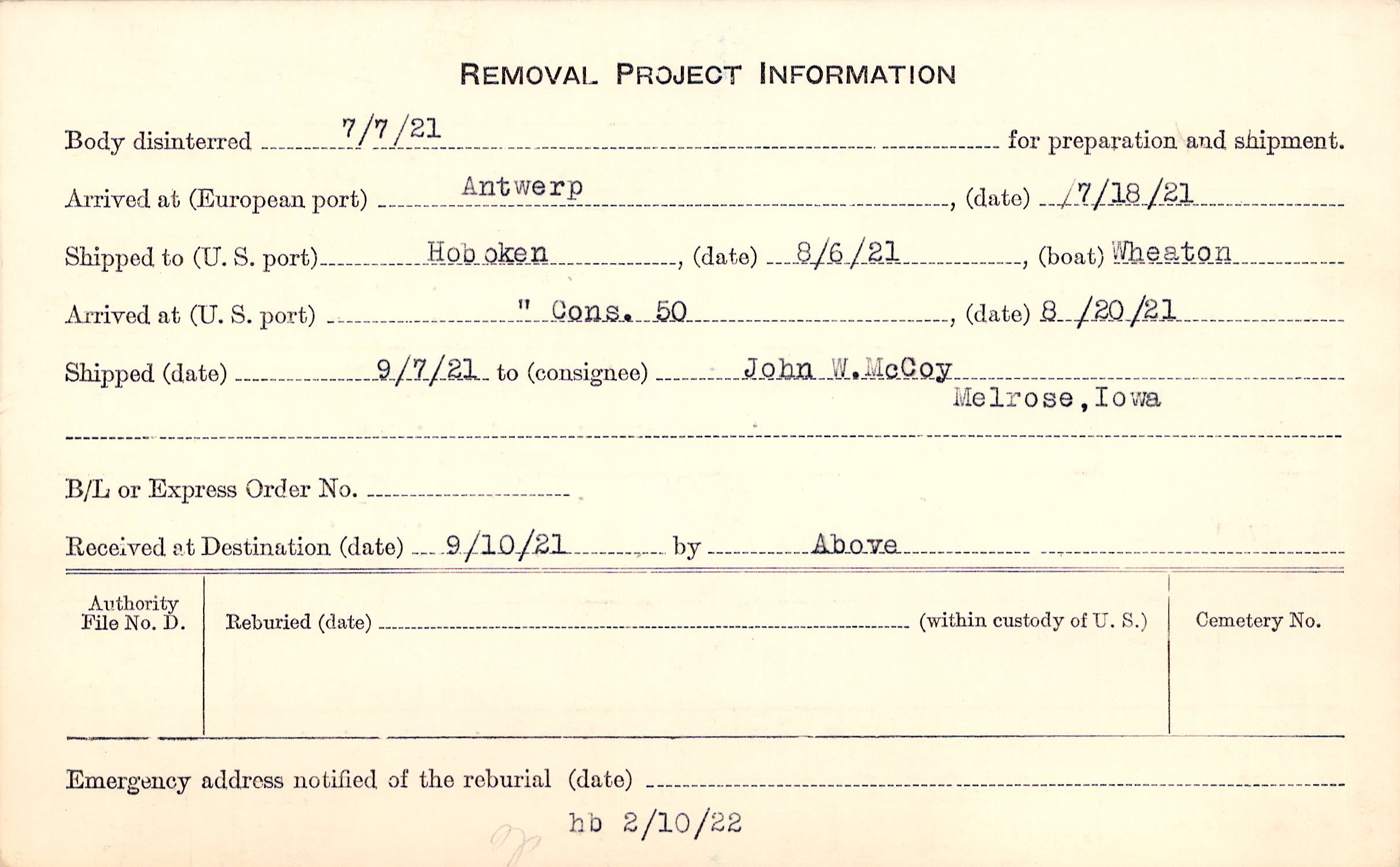 Body disinterred 7/7/1921 for preparation and shipment.