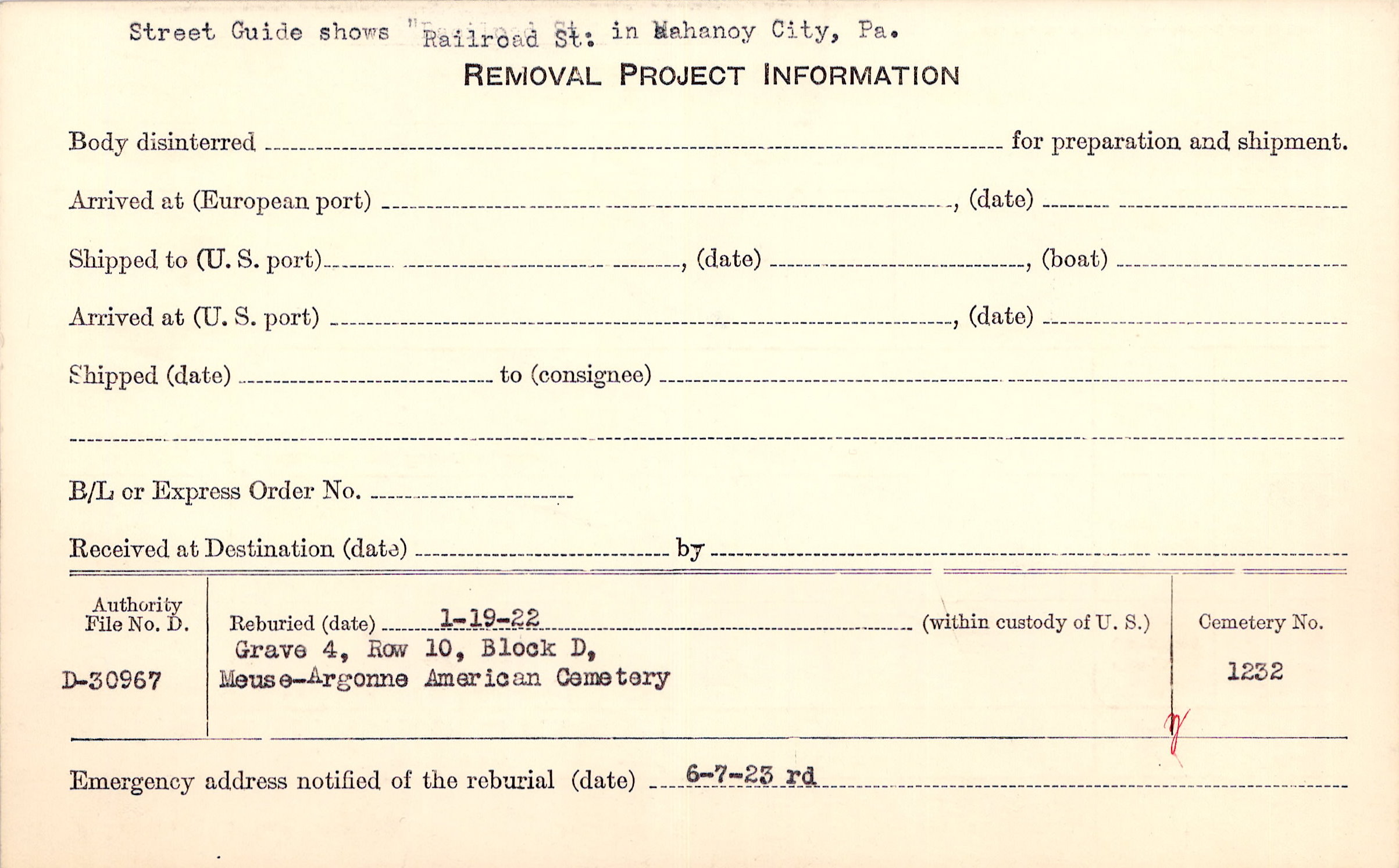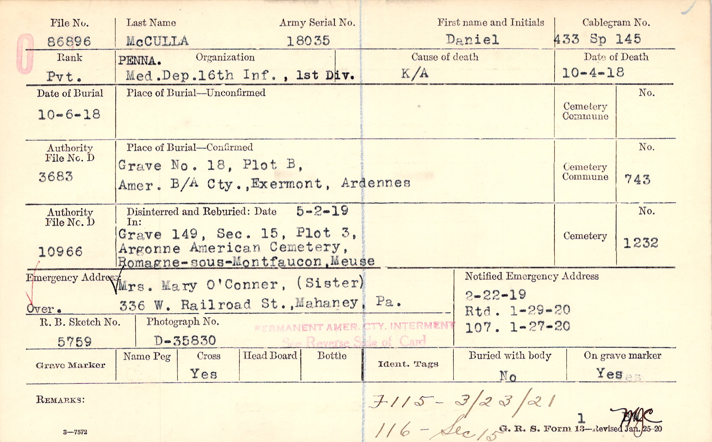 2/22/1919, Rtd 1/29/1920, Form 107: 1/27/1920