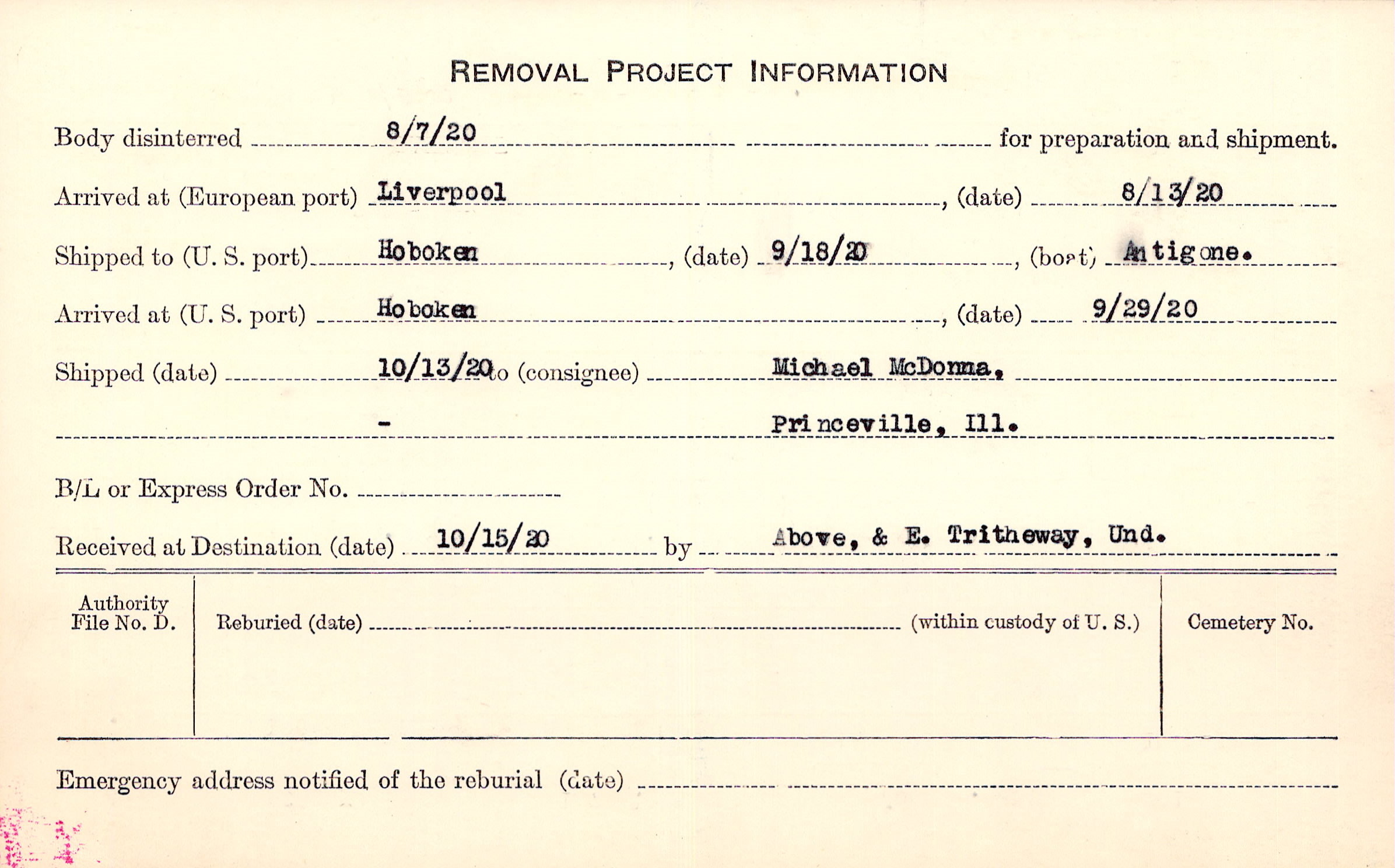Body disinterred 8/7/1920 for preparation and shipment.