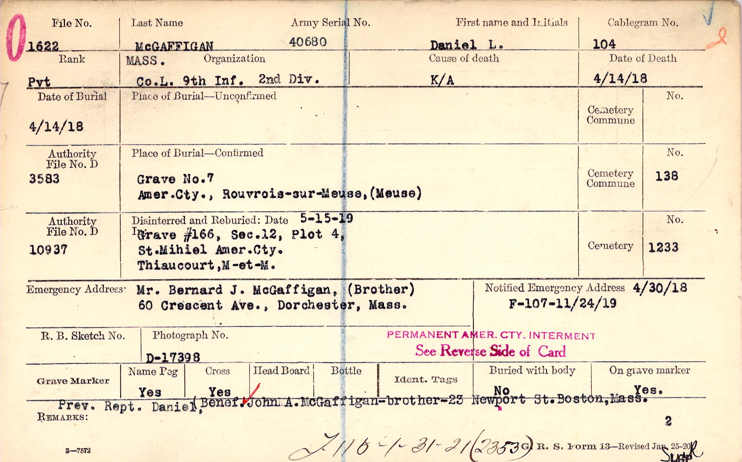 Mr. Bernard J. McGaffigan, (Brother), 60 Crescent Ave., Dorchester, Mass.