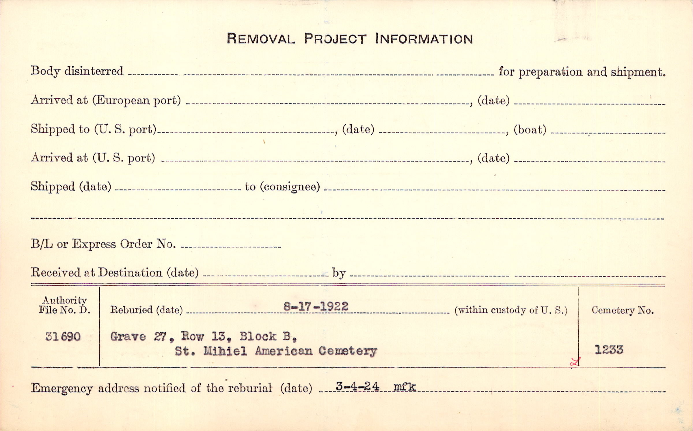| Permanent Burial in Foreign Cemetery |