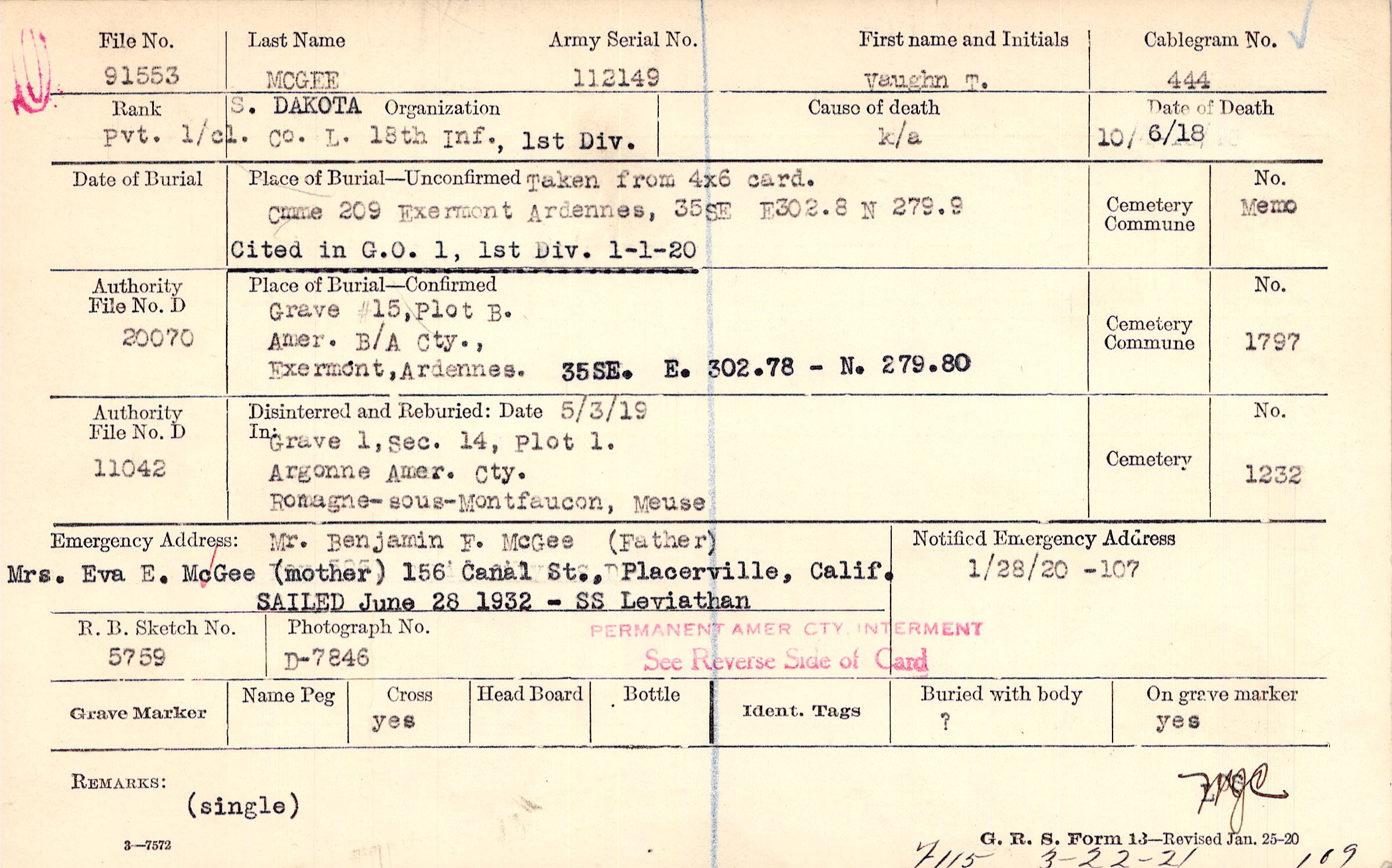 Mr. Benjamin F. McGee (Father), 156 Canal St., Placerville, Calif., Mrs. Eva E. McGee(mother) SAILED June 28 1932-SS Leviathan