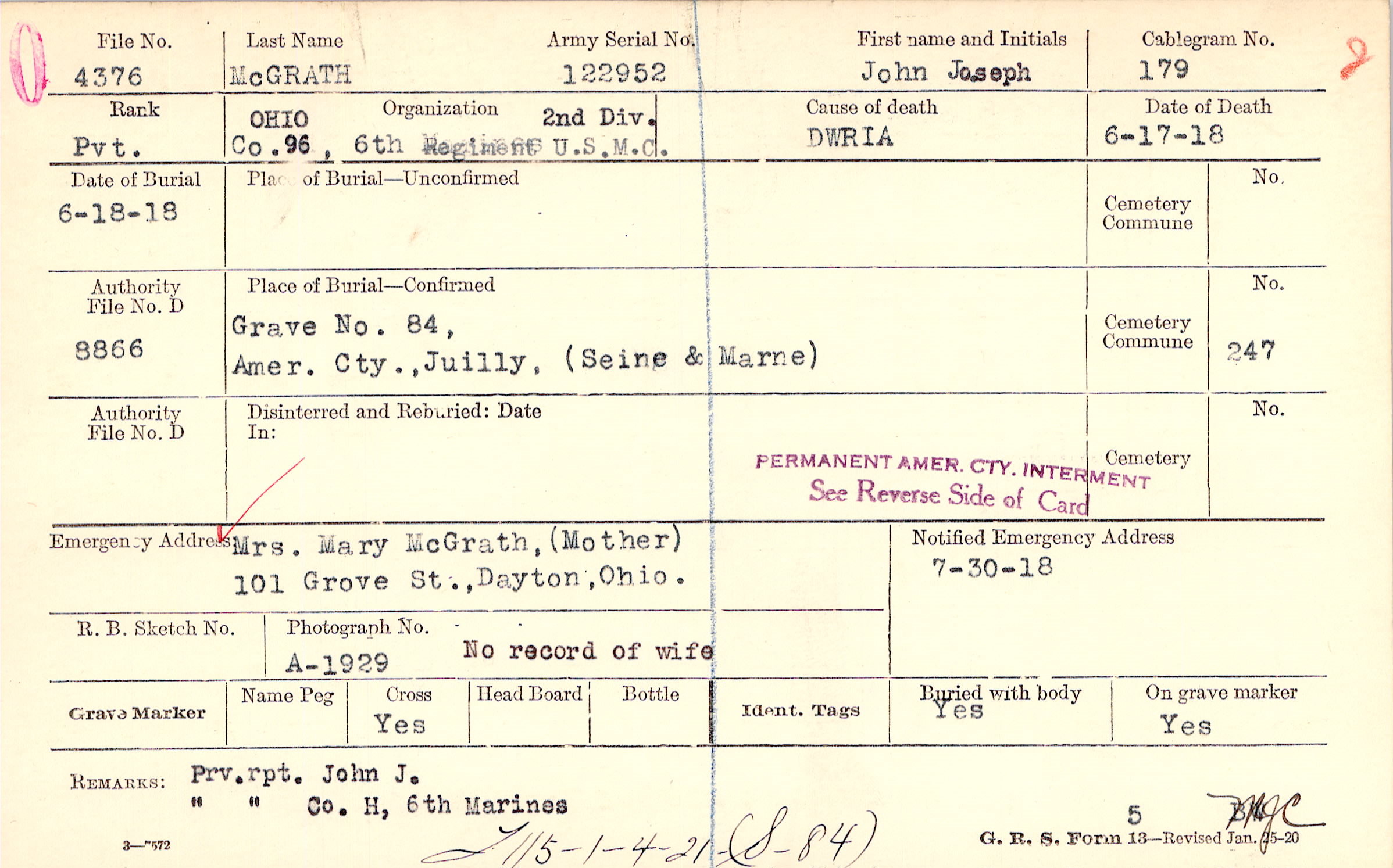 Mrs. Mary McGrath, (Mother), 101 Grove St., Dayton, Ohio., No record of wife