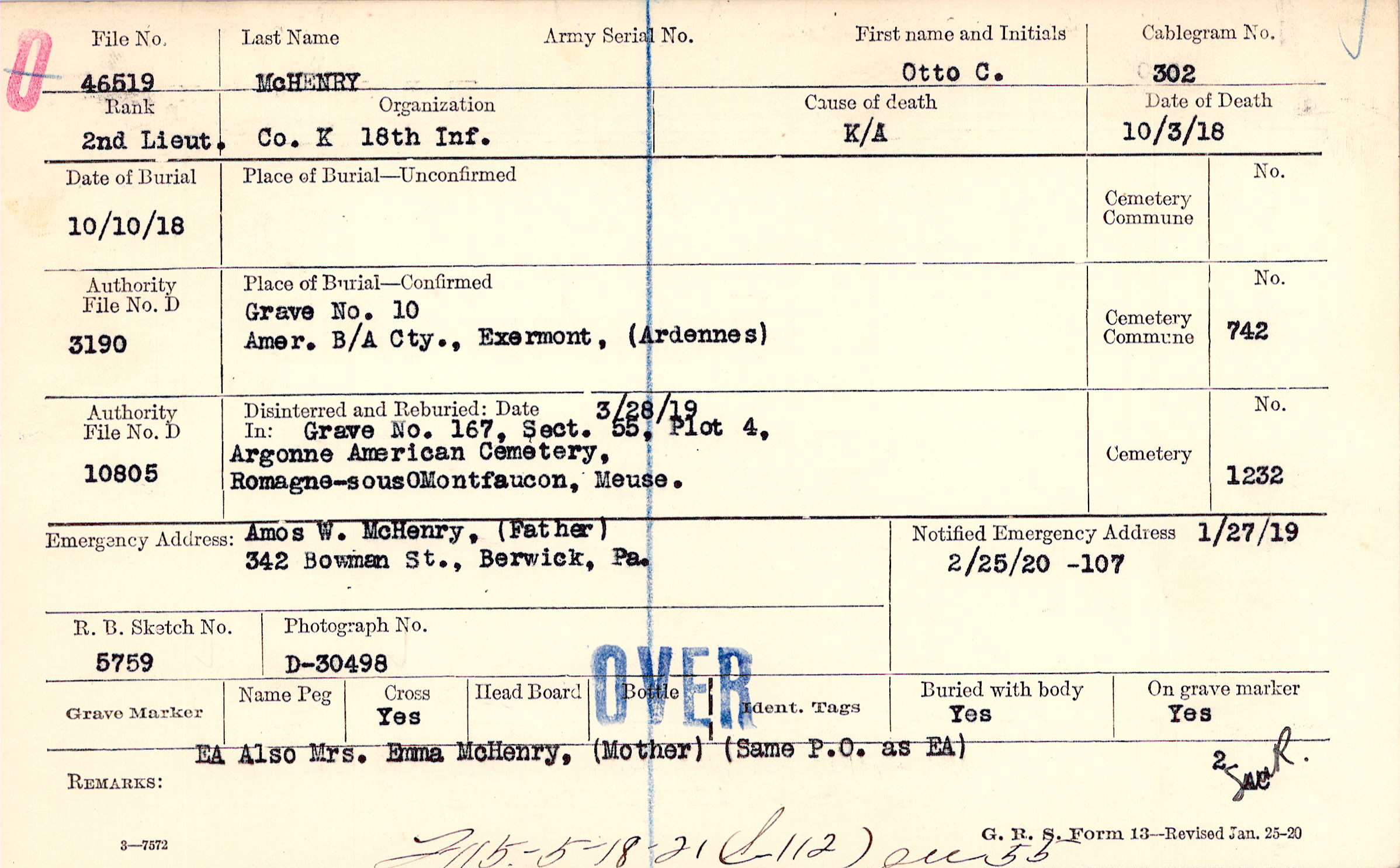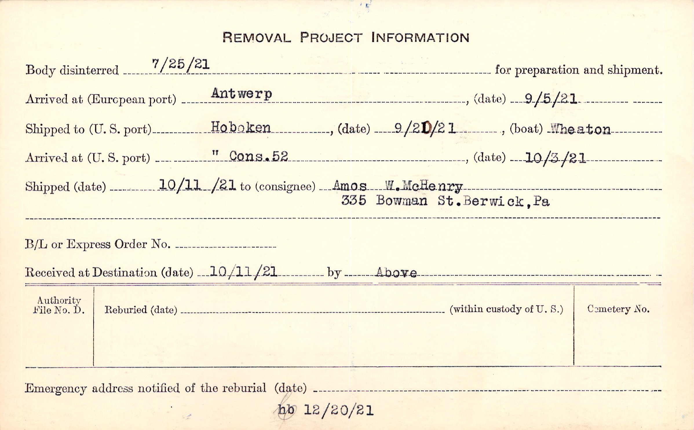 Amos W. McHenry, (Father), 342 Bowman St., Berwick, Pa., EA Also Mrs. Emma McHenry, (Mother) (Same as P.O. as EA)