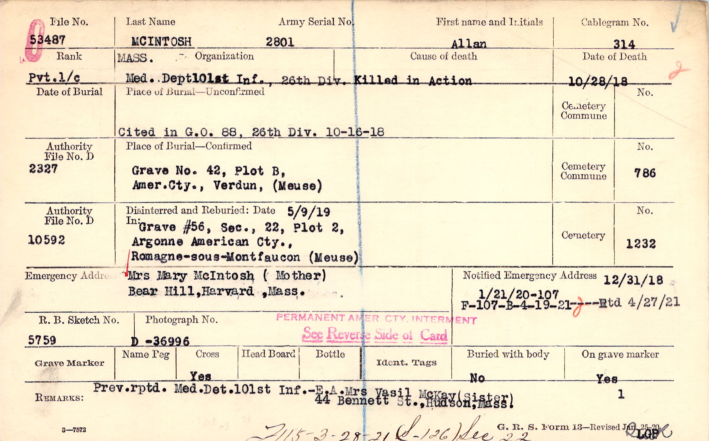 Prev. rptd. Med. Det. 101st Inf. - E.A. Mrs. Vasil McKay (sister) 44 Bennett St., Hudson, Mass., F115-3-28-21 (S-126) Sec 22
