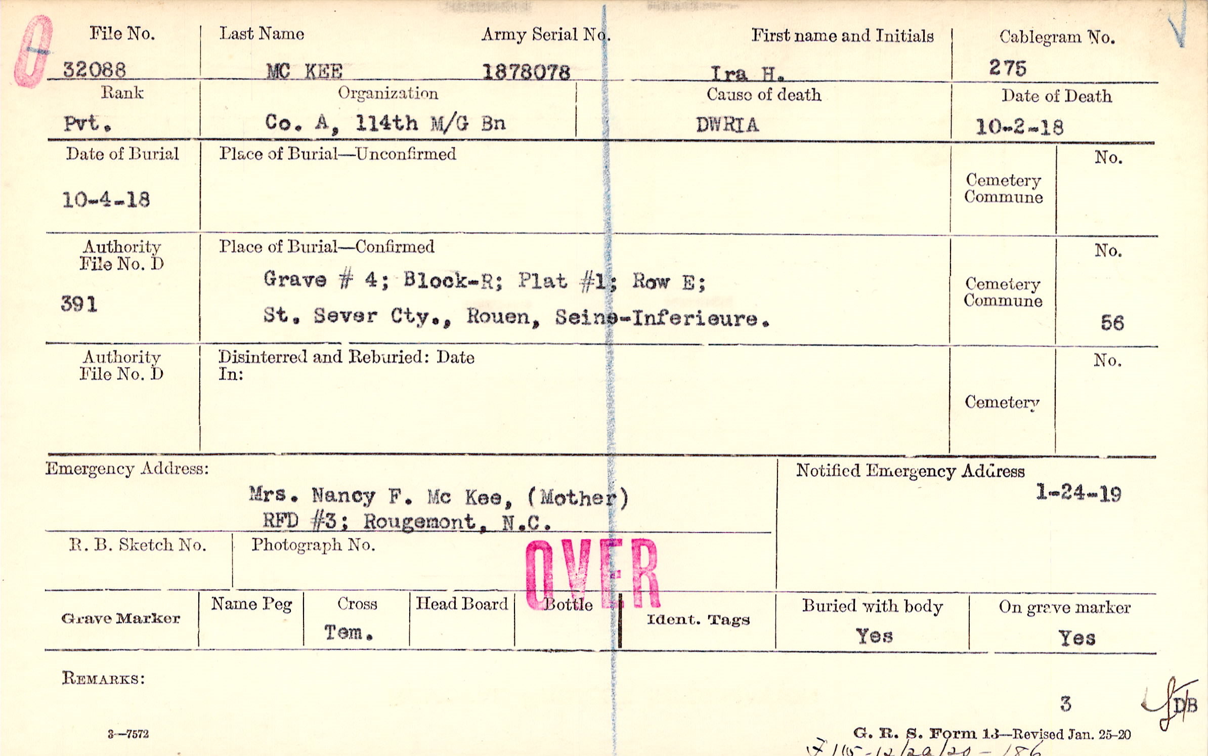 Grave # 4; Block-R; Plat #1; Row E;,St. Sever Cty., Rouen, Seine-Inferieure.,