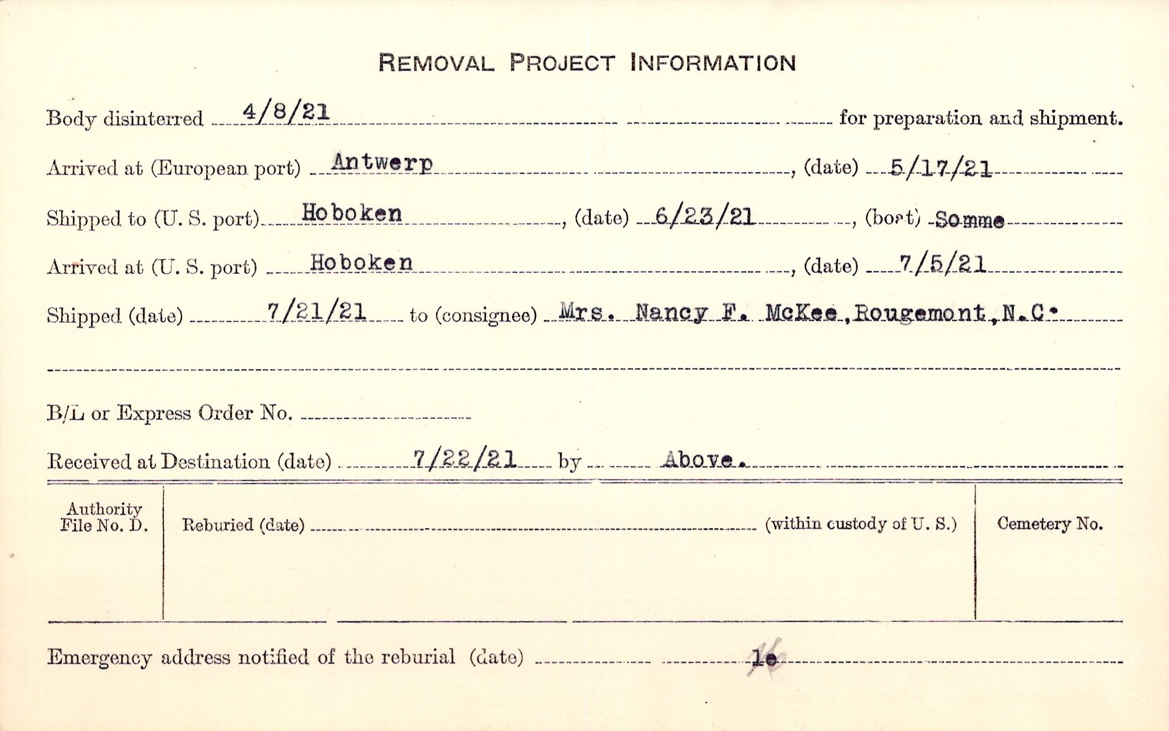 Body disinterred 4/8/1921 for preparation and shipment.