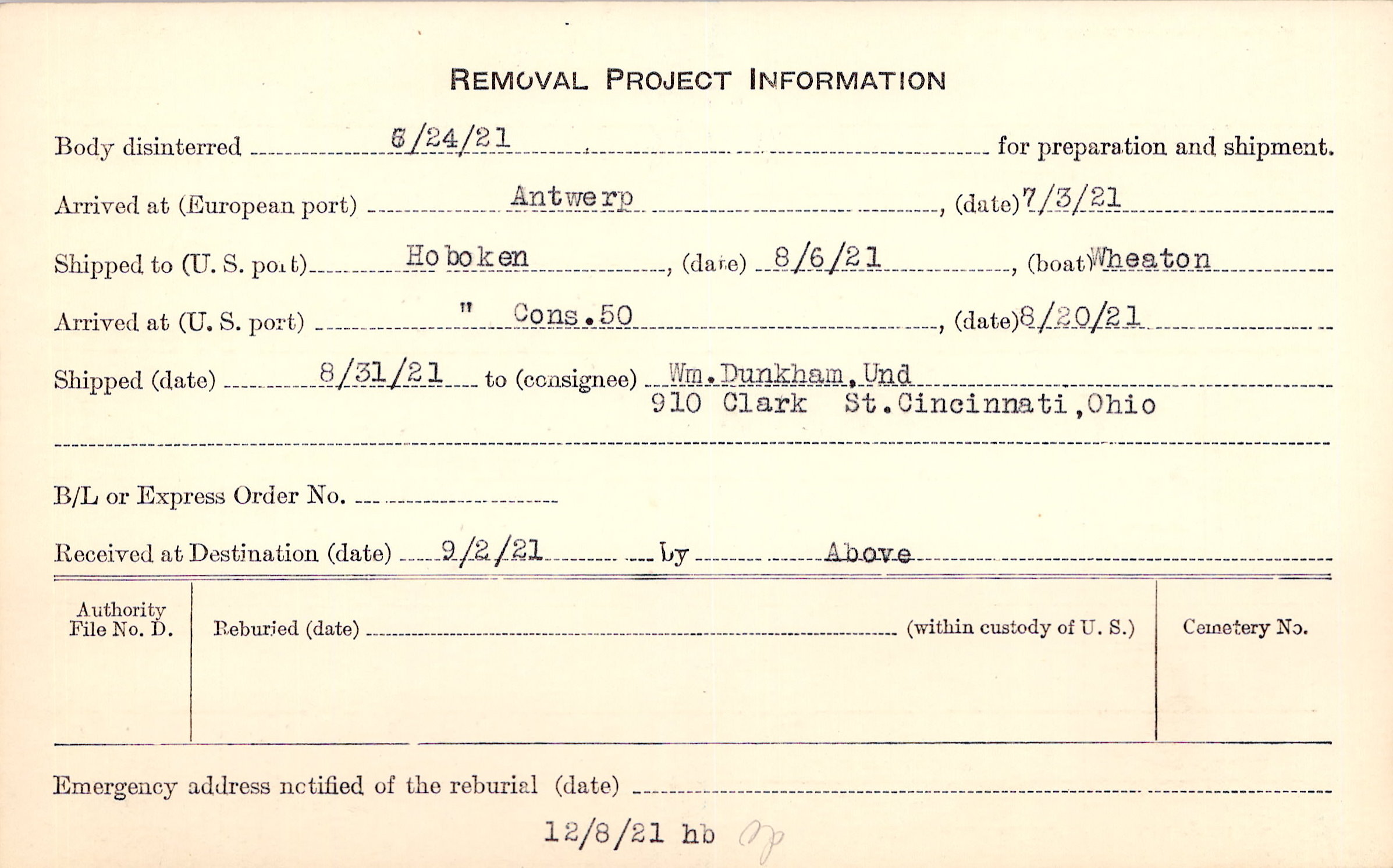 Body disinterred 6/24/1921 for preparation and shipment.