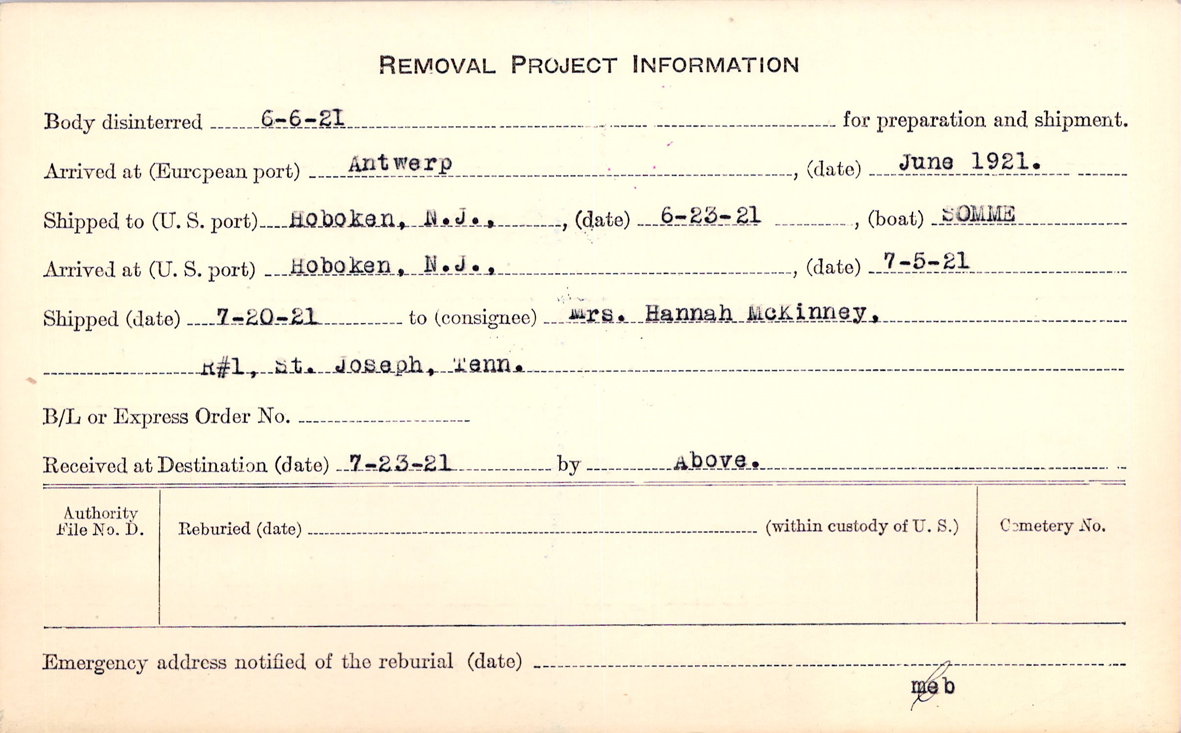 Body disinterred 6/6/1921 for preparation and shipment.