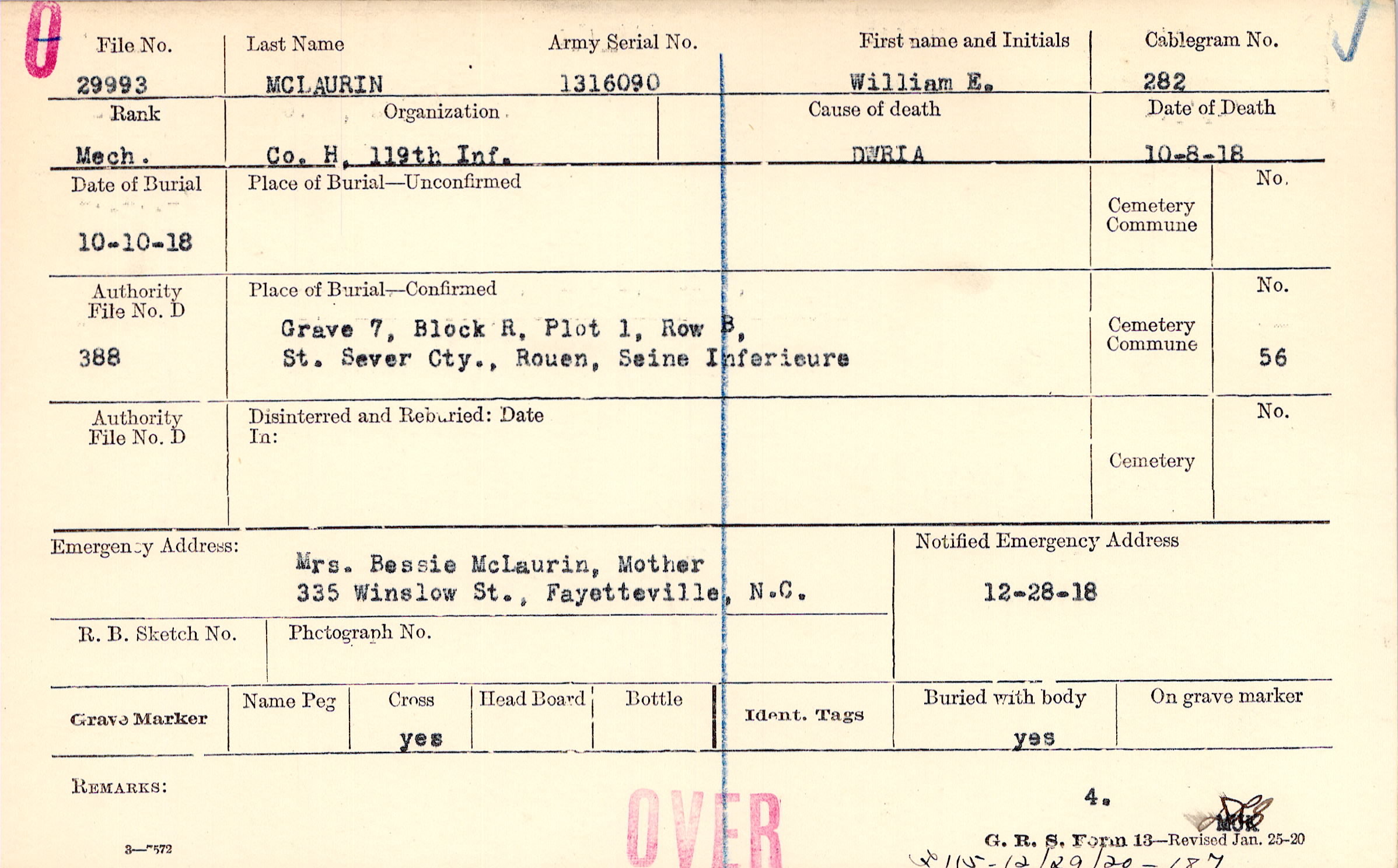 Mrs. Bessie McLaurin, Mother, 335 Winslow St., Fayetteville, N.C.