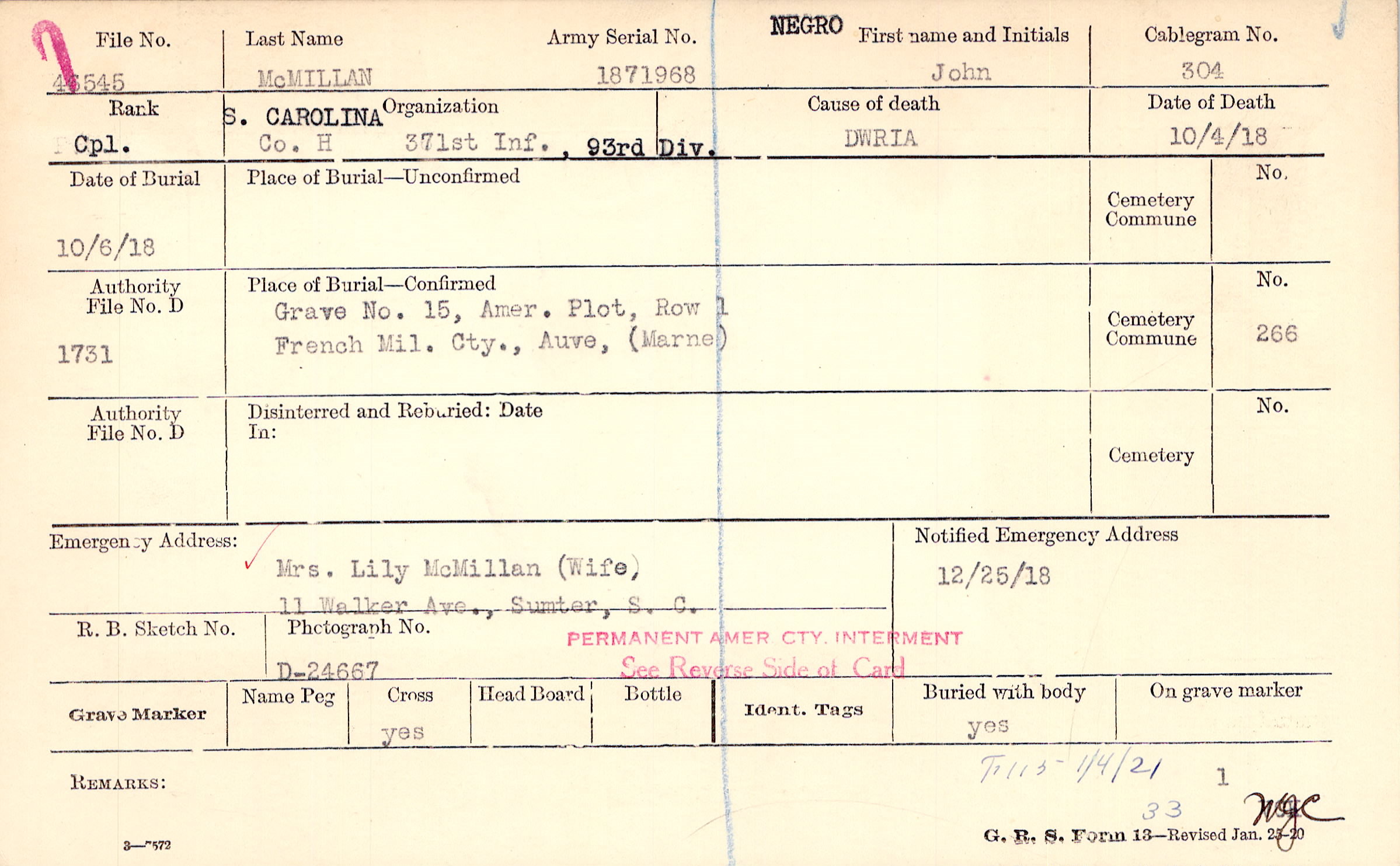 Mrs. Lily McMillan (Wife), 11 Walker Ave., Sumter, S. C.