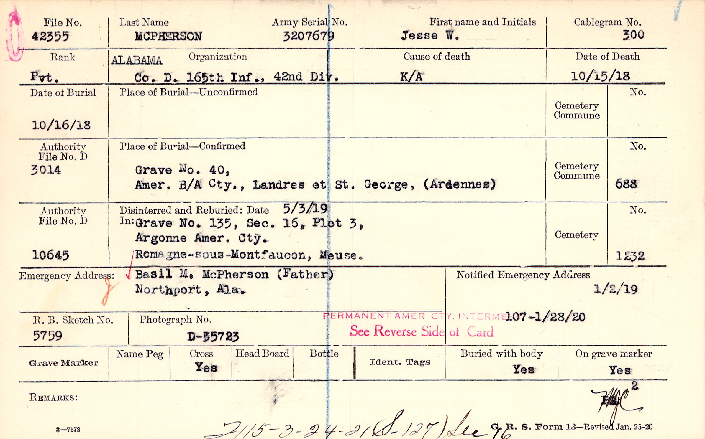 Grave 135, Section 16, Plot 3, Argonne American Cemetery, Romagne-sous-Montfaucon, Meuse