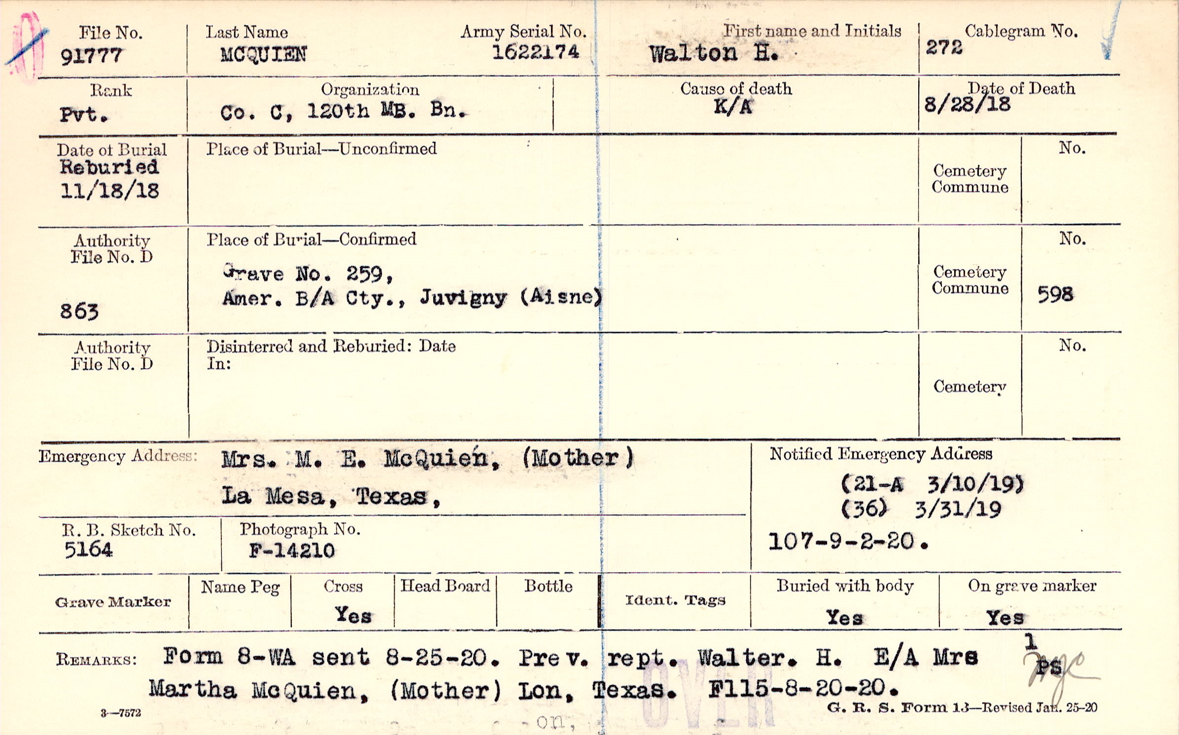 Prev. rept. Walter. H. E/.A Mrs Martha McQuien (Mother), Lon, Texas, Form 8-WA send 8-25-20., F115-8-20-20.