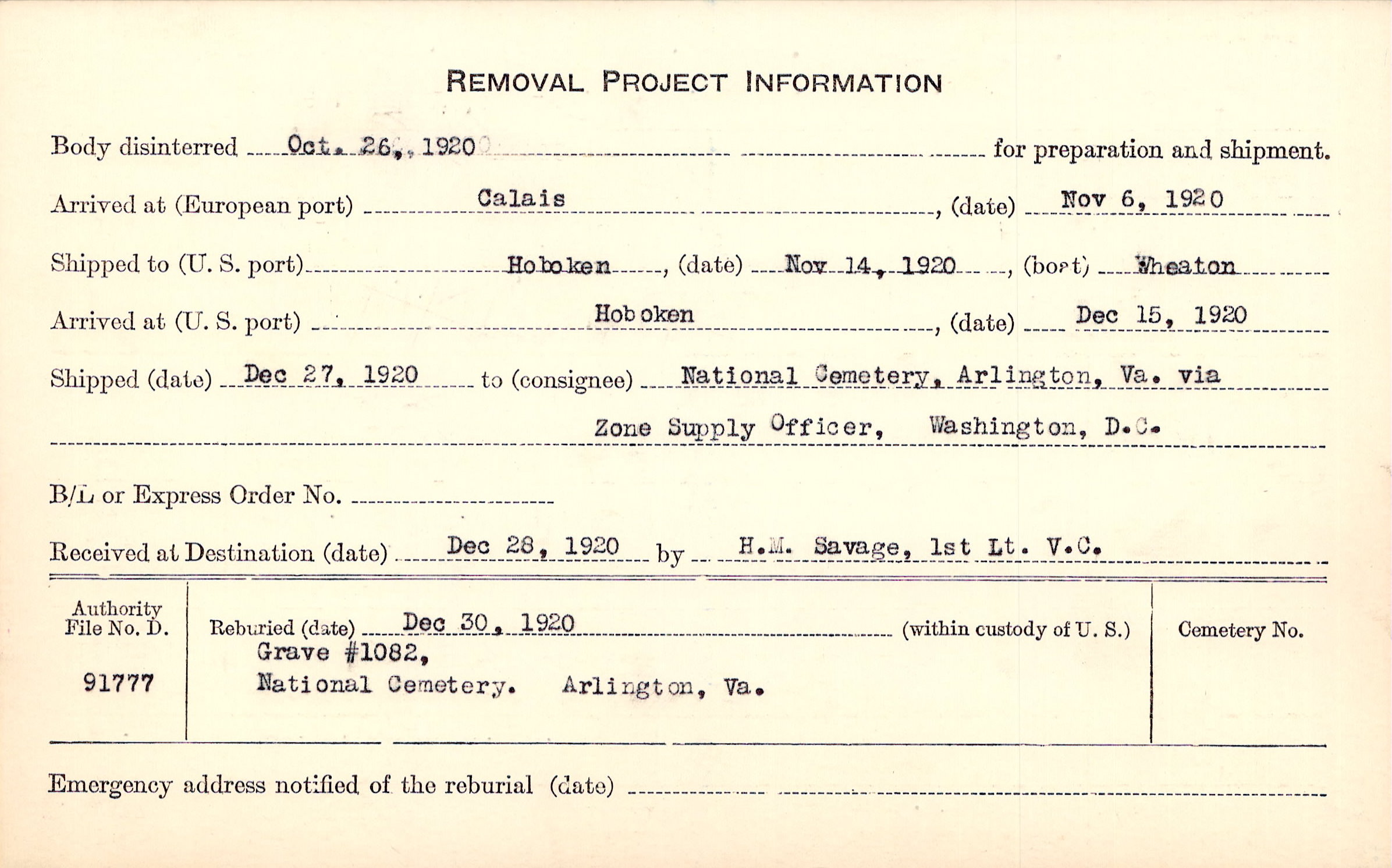 Body disinterred 10/26/1920 for preparation and shipment.