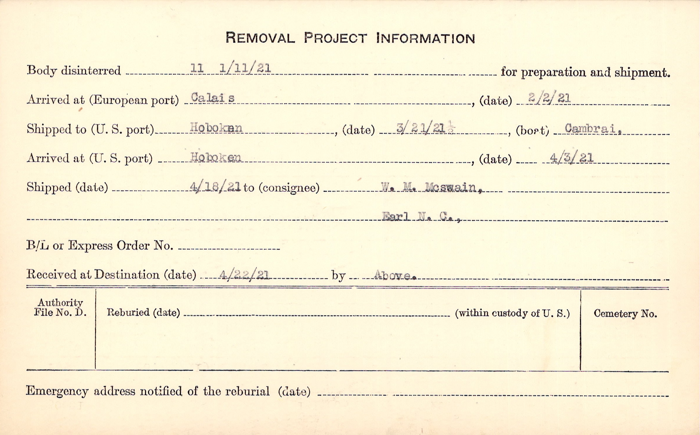 Body disinterred 1/11/1921 for preparation and shipment.