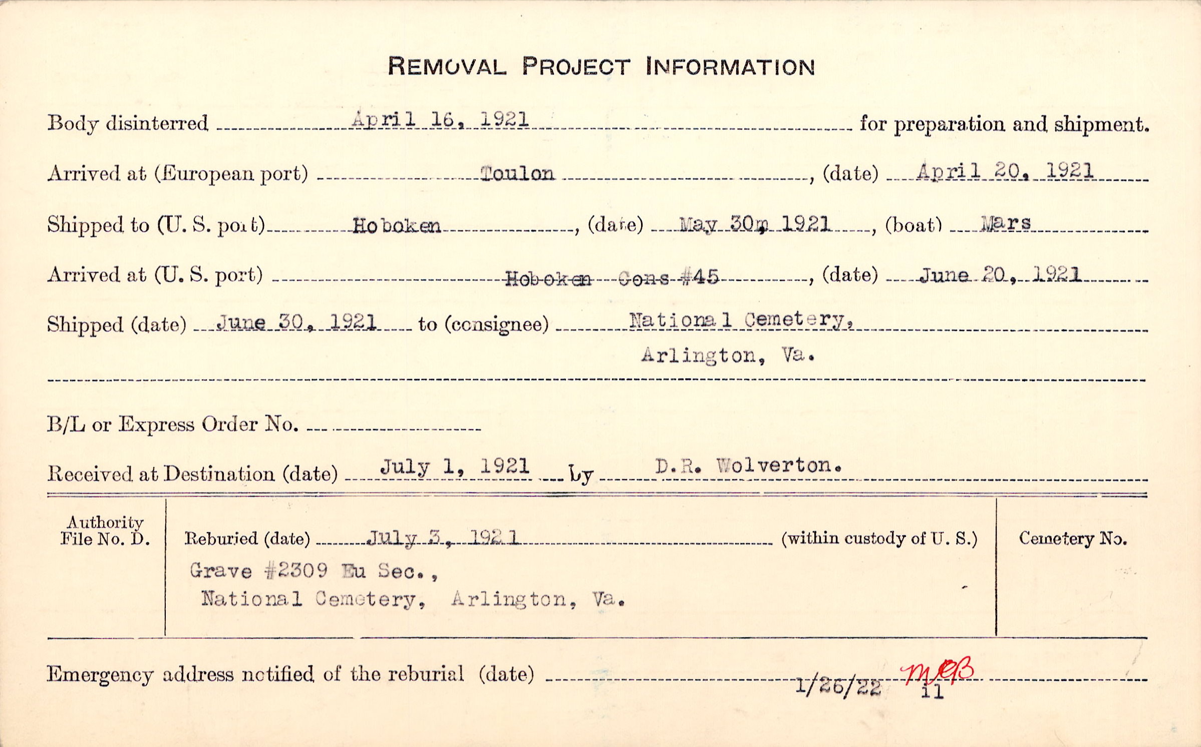 Body disinterred 4/16/1921 for preparation and shipment.