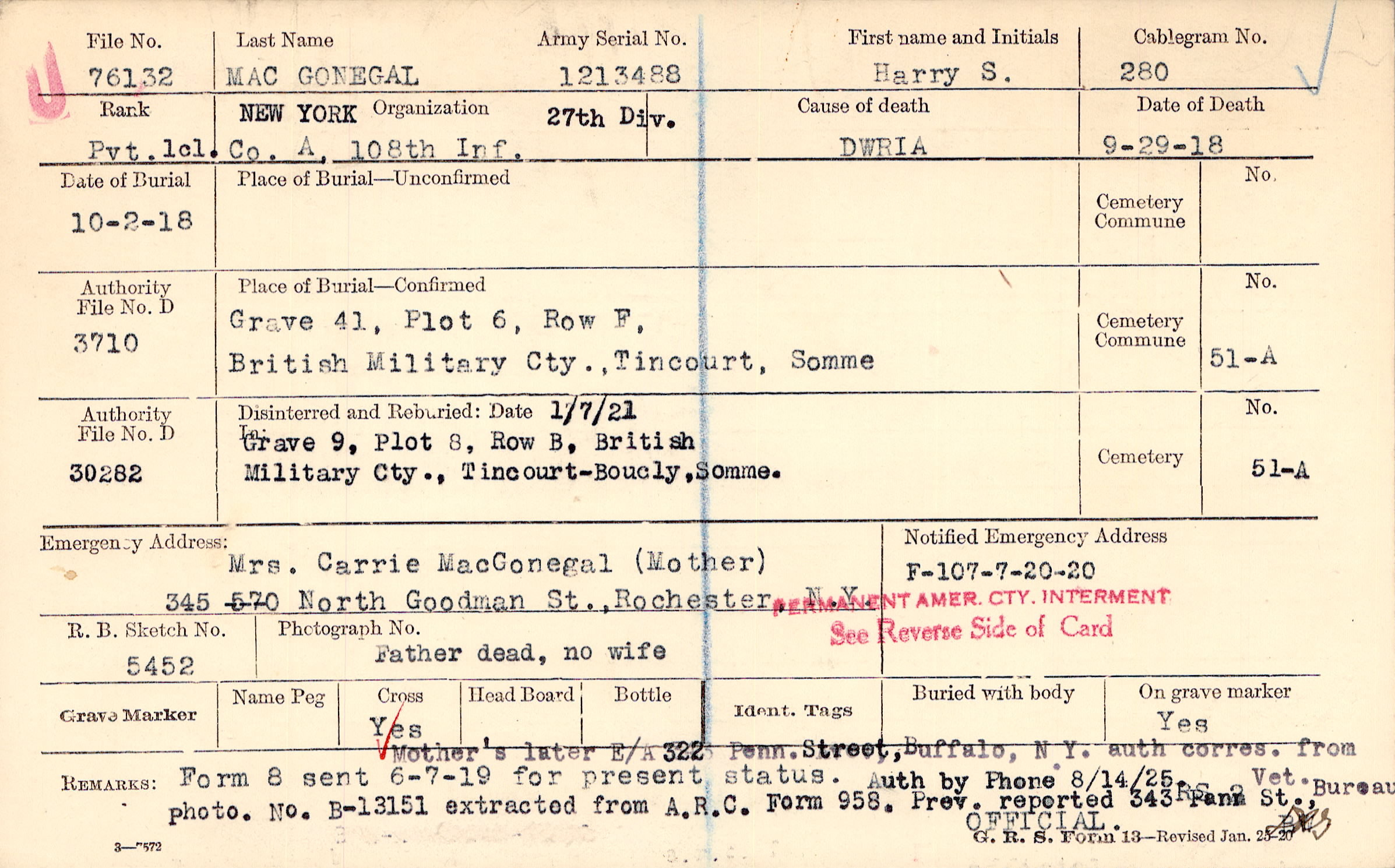 Mrs. Carrie MacGonegal (Mother), 345 North Goodman St., Rochester, N.Y., Father dead, no wife