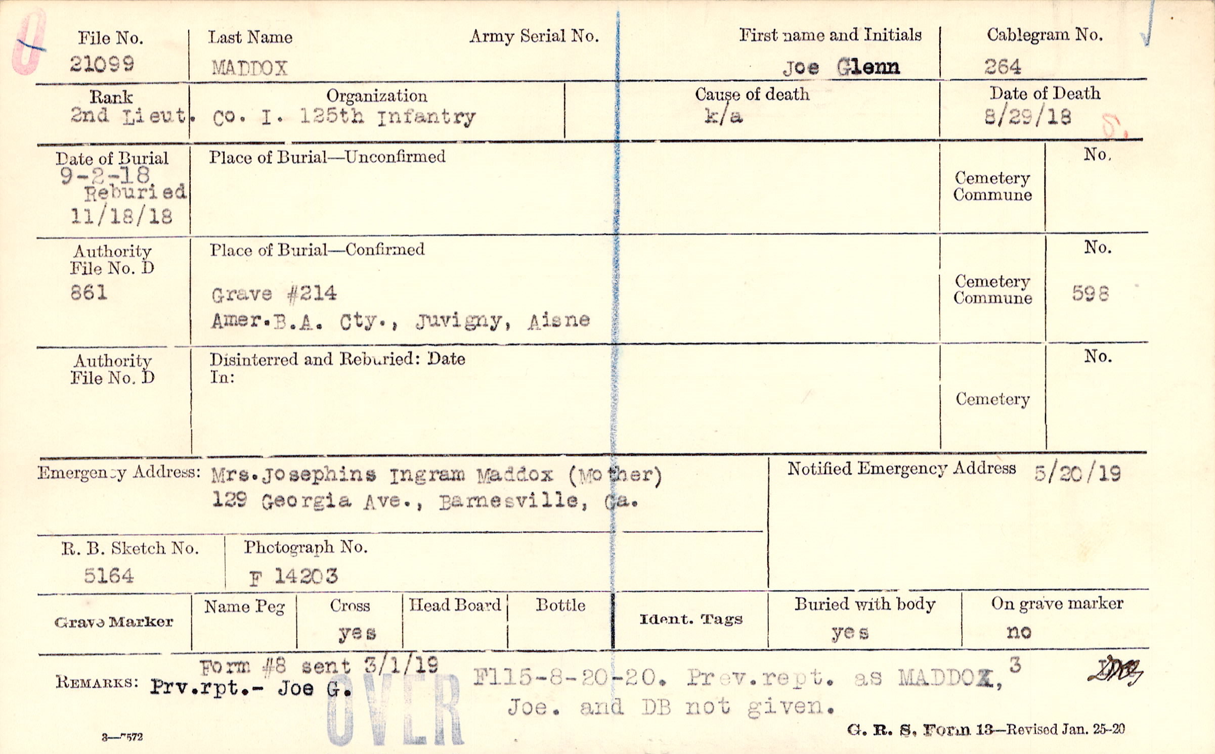 Grave #214, Amer. B/A Cty., Juvigny, Aisne.