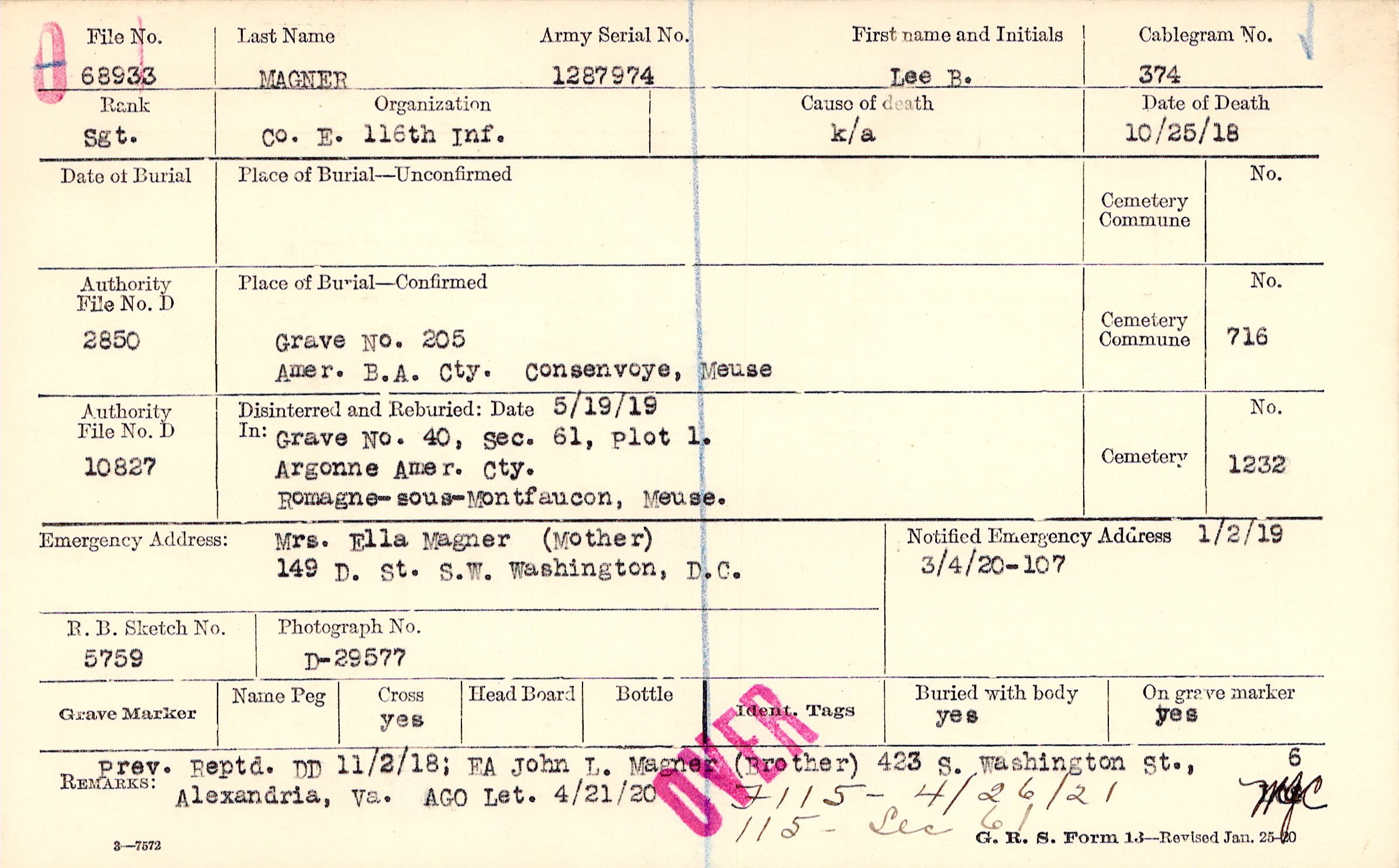 Mrs. Ella Magner (Mother), 149 D. St. S.W. Washington, D.C.