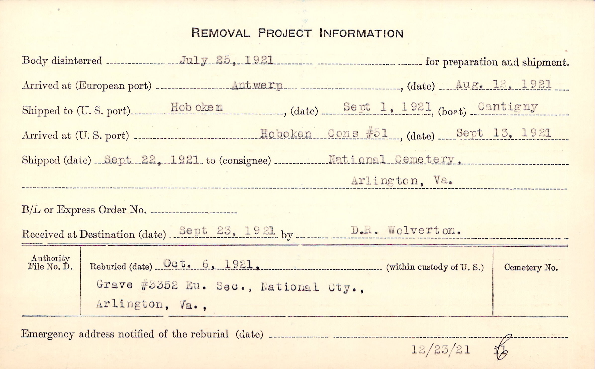 Body disinterred 7/25/1921 for preparation and shipment.