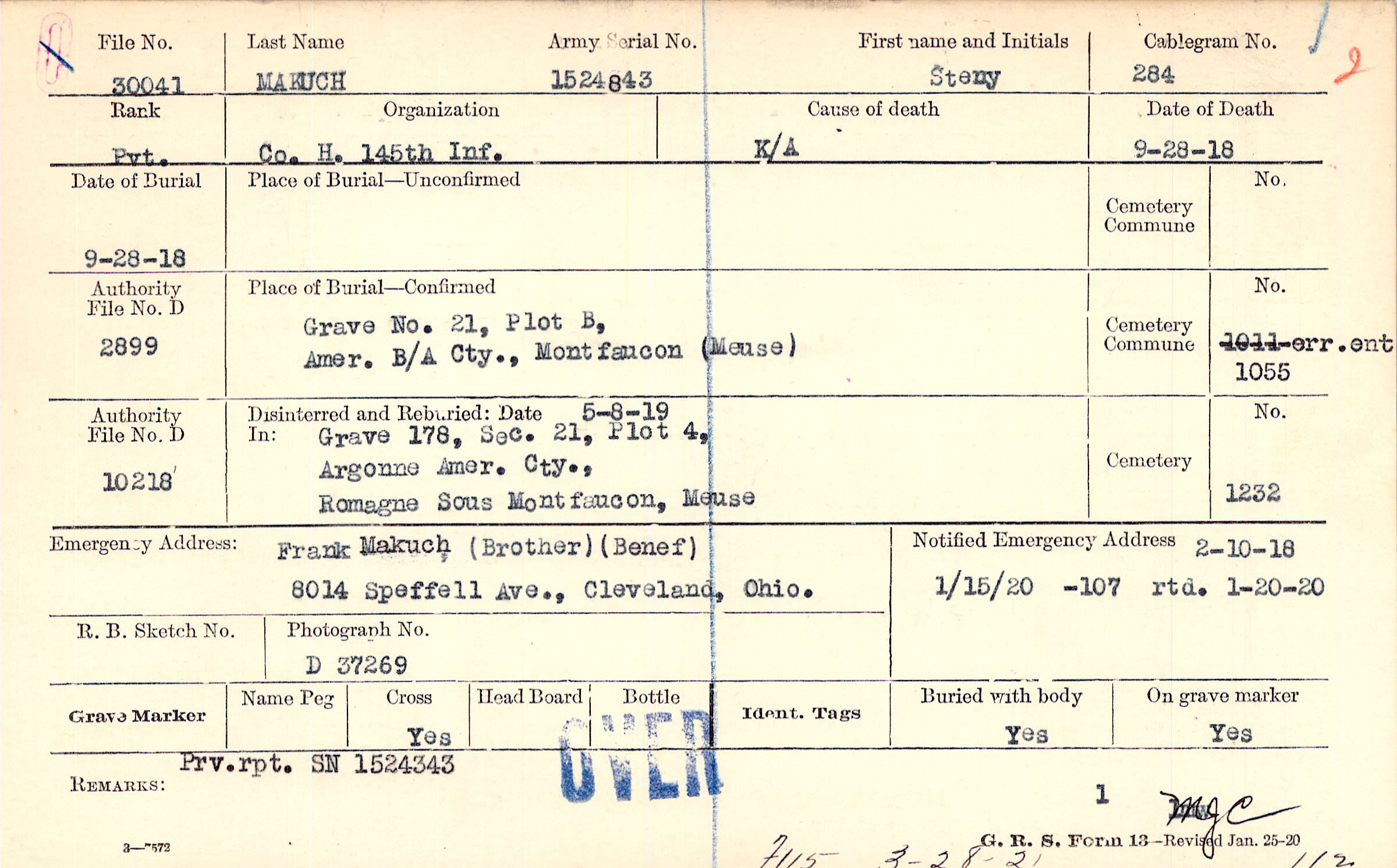Frank Makuch (Brother), 8014 Speffell Ave., Cleveland, Ohio., (Benef)