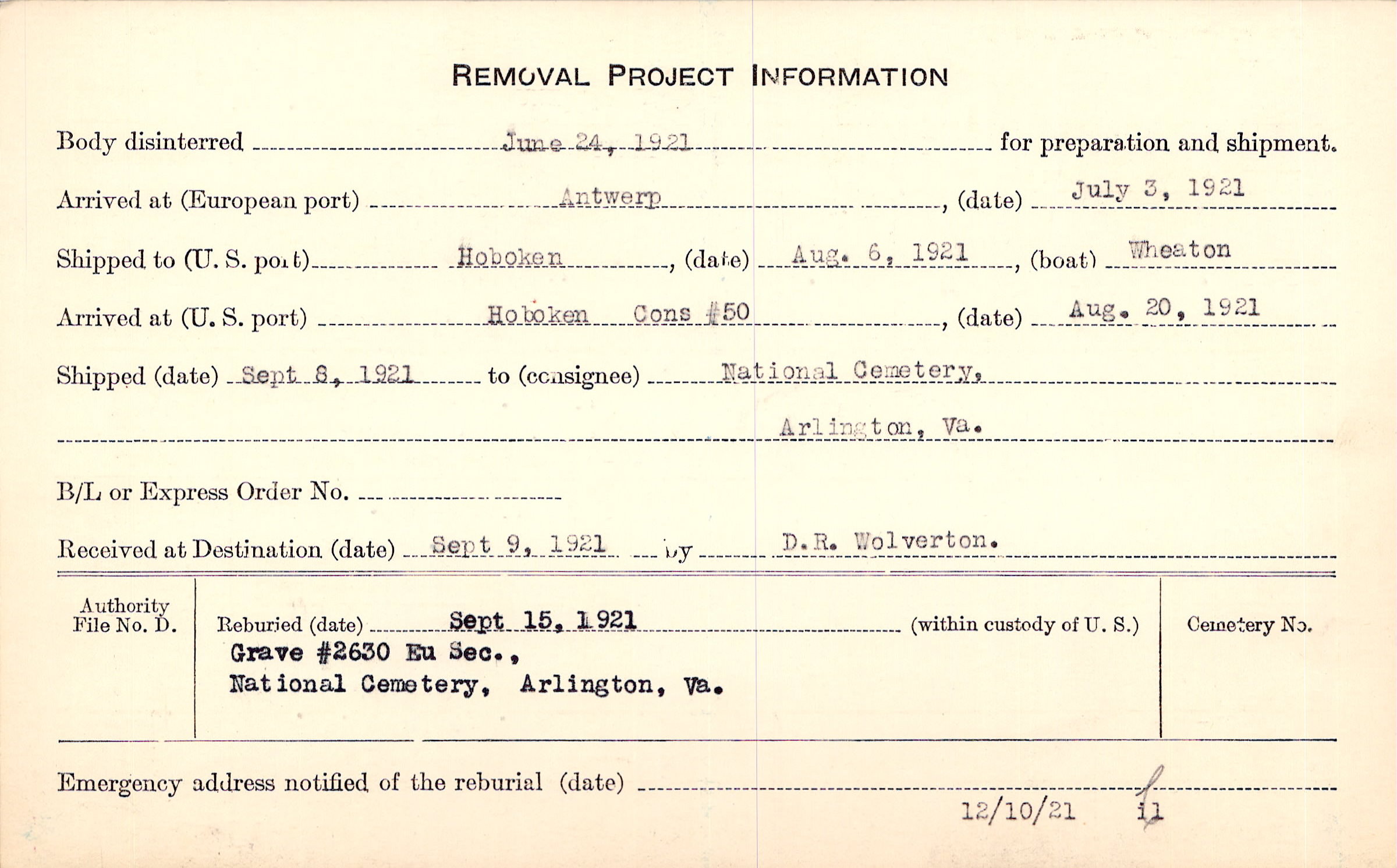 Body disinterred 6/24/1921 for preparation and shipment.
