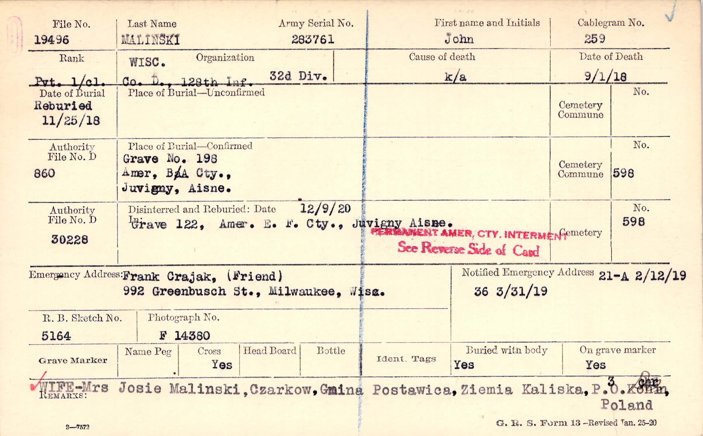 Frank Crajak, (Friend), 992 Greenbusch St., Milwaukee, Wisc.