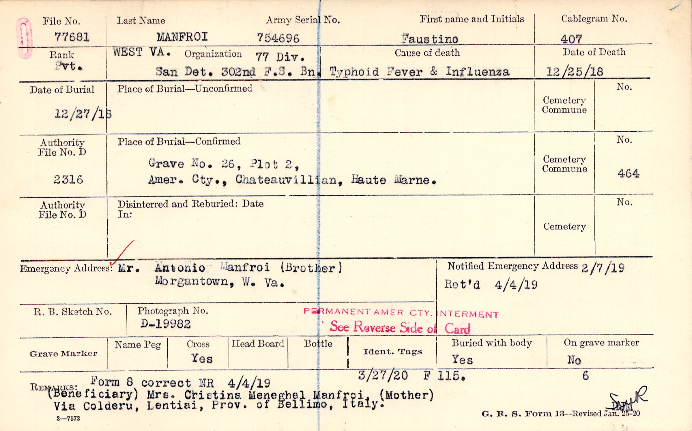 Mr. Antonio Manfroi (Brother), Morgantown, W. Va., 3/27/20 F115. 6 Form 8 correct NR 4/4/19 (Beneficiary) Mrs Christina Meneghel Manfroi, (Mother) Via Colderu, Lentiai, Prov. of Bellimo, Italy. DJM SR