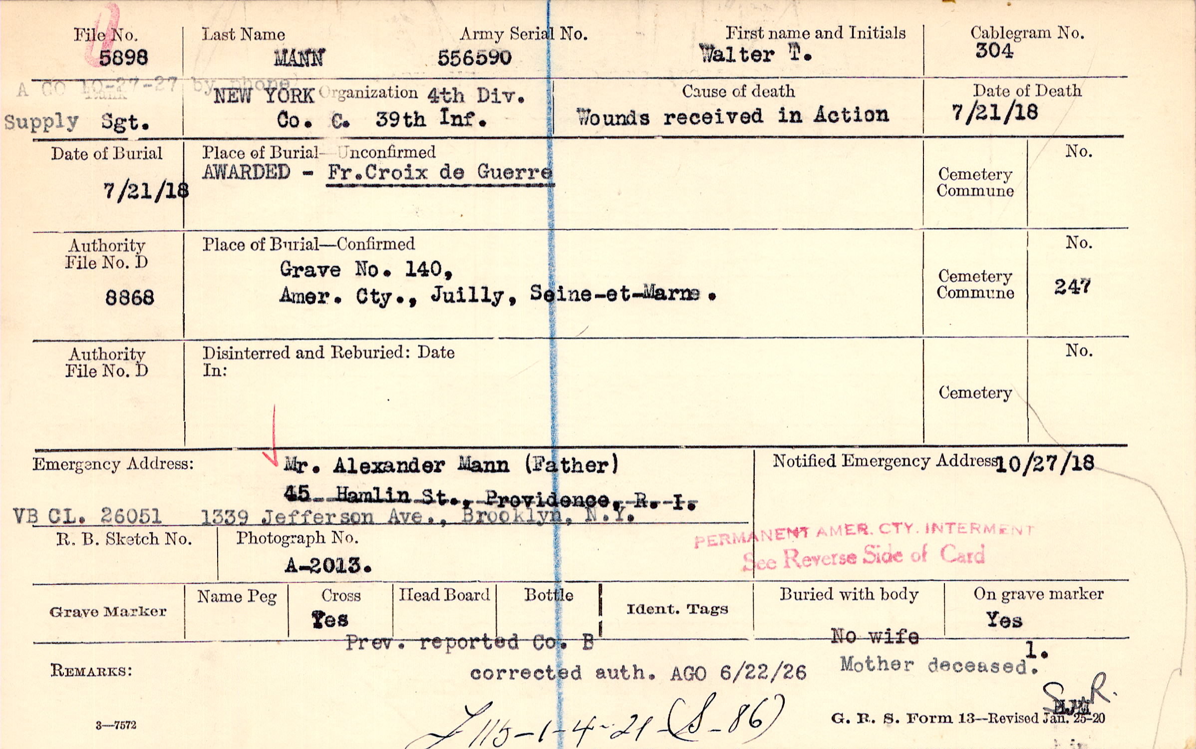 Mr. Alexander Mann (Father), 1339 Jefferson Ave., Brooklyn, N.Y., VB CL. 26051