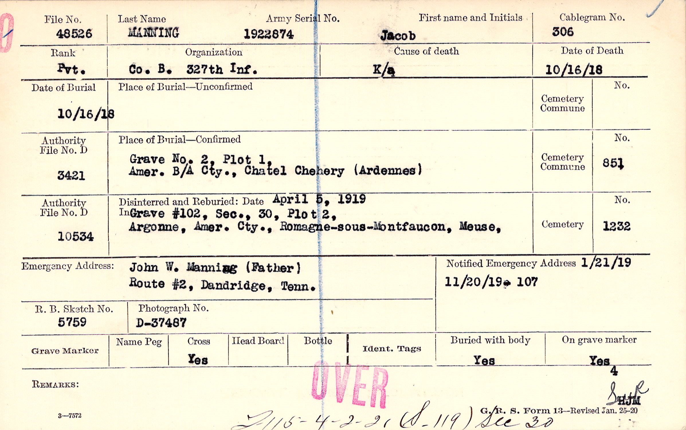 John W. Manning (Father), Route #2, Dandridge, Tenn.