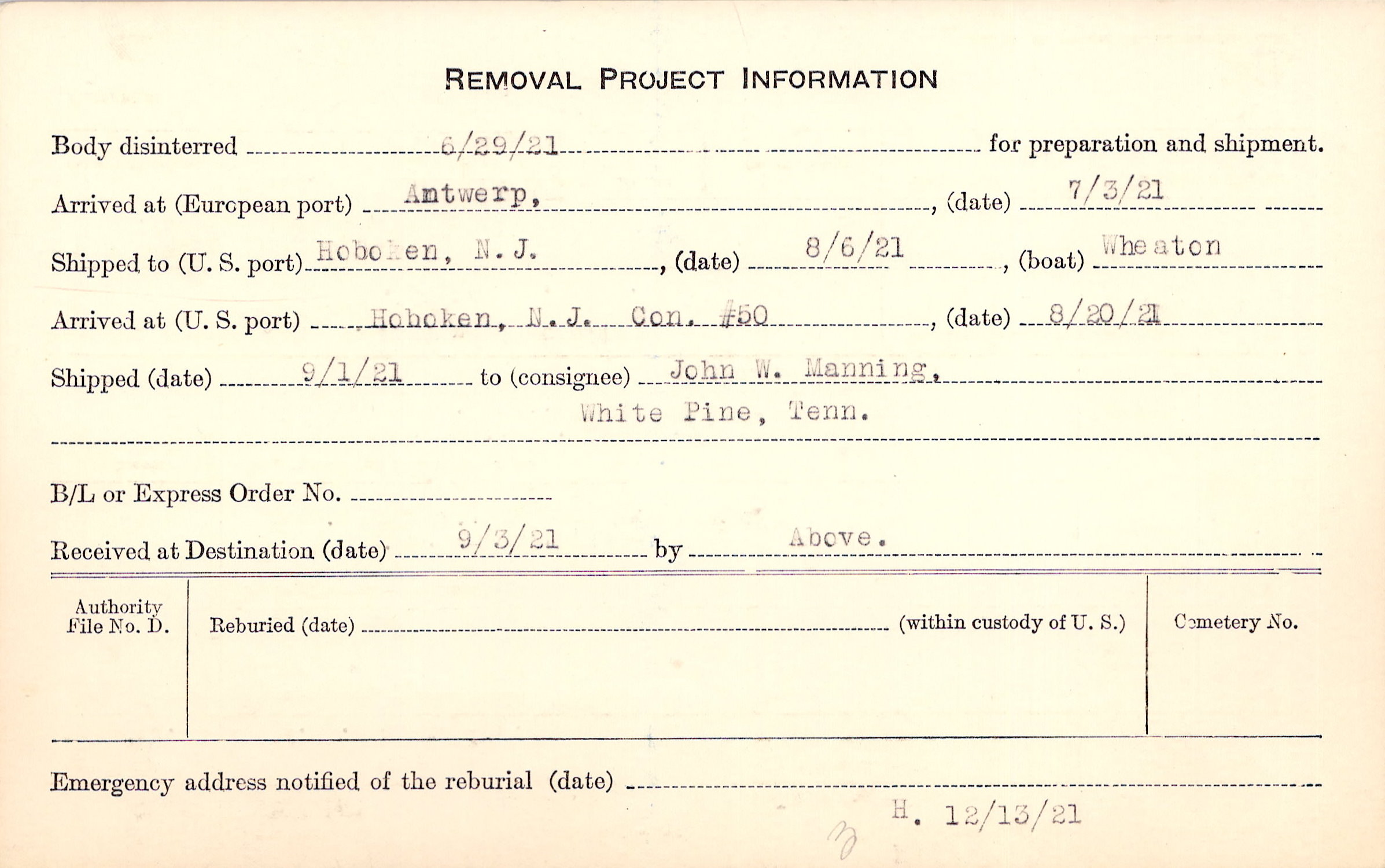 Body disinterred 6/29/1921 for preparation and shipment.