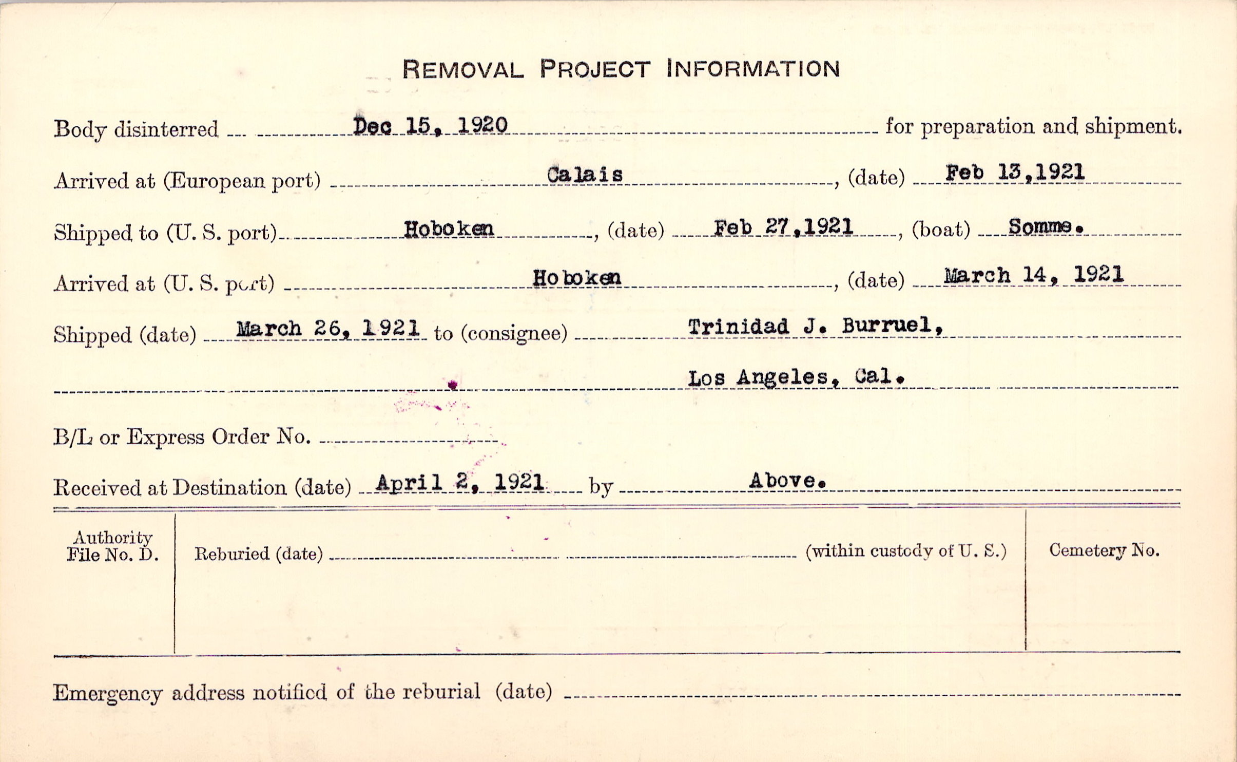 Body disinterred 12/15/1920 for preparation and shipment.